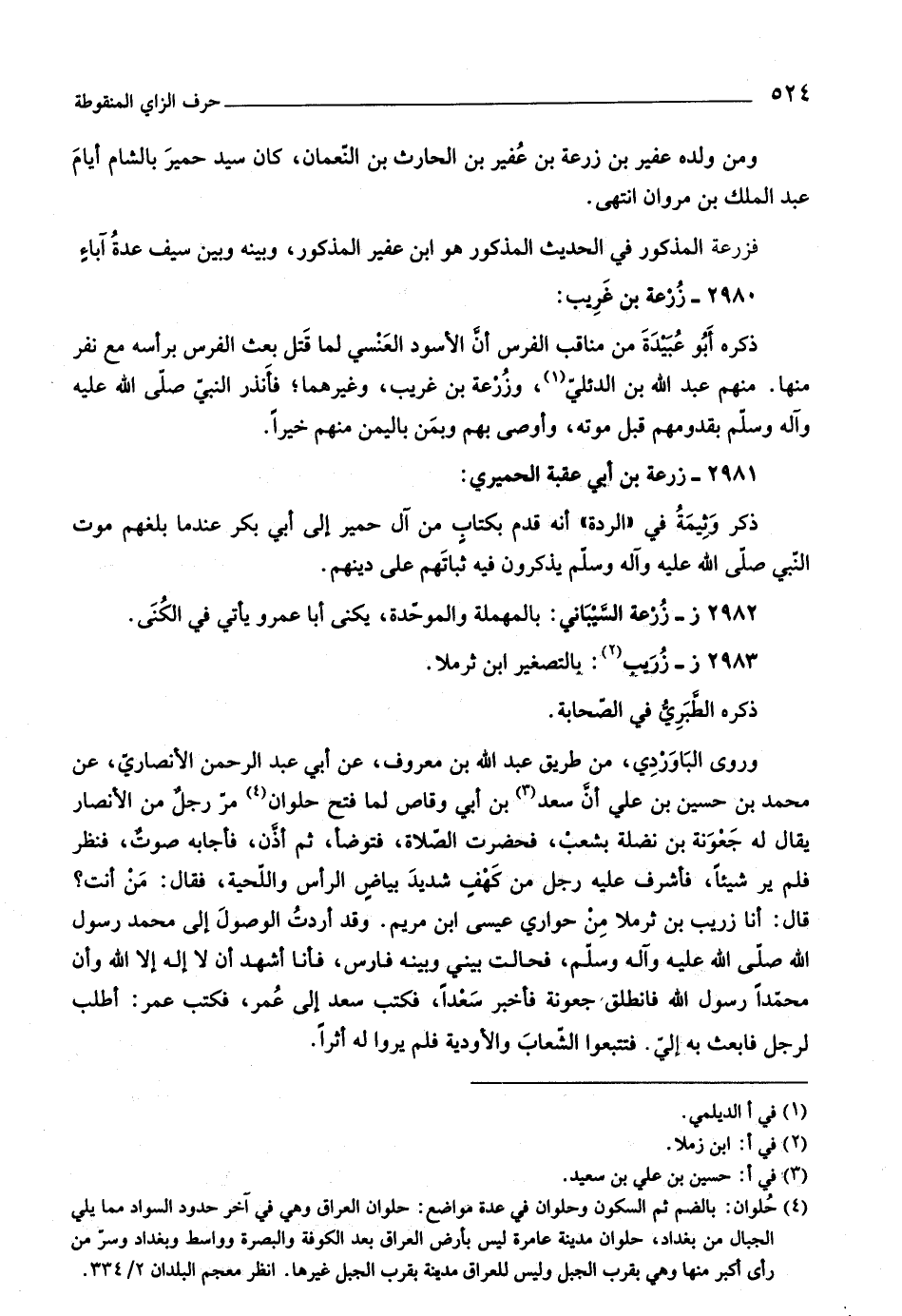 قال: أنا زريب بن ثرملا من حواري عيسى ابن مريم. وقد أردت الوصول إلى محمد رسول اللَّه صلّى اللَّه عليه وآله وسلّم، فحالت بيني وبينه فارس، فأنا أشهد أن لا إله إلا اللَّه وأن محمّدا رسول اللَّه فانطلق جعونة فأخبر سعدا، فكتب سعد إلى عمر، فكتب عمر: أطلب لرجل فابعث به إليّ. فتتبعوا الشّعاب والأودية فلم يروا له أثرا.
