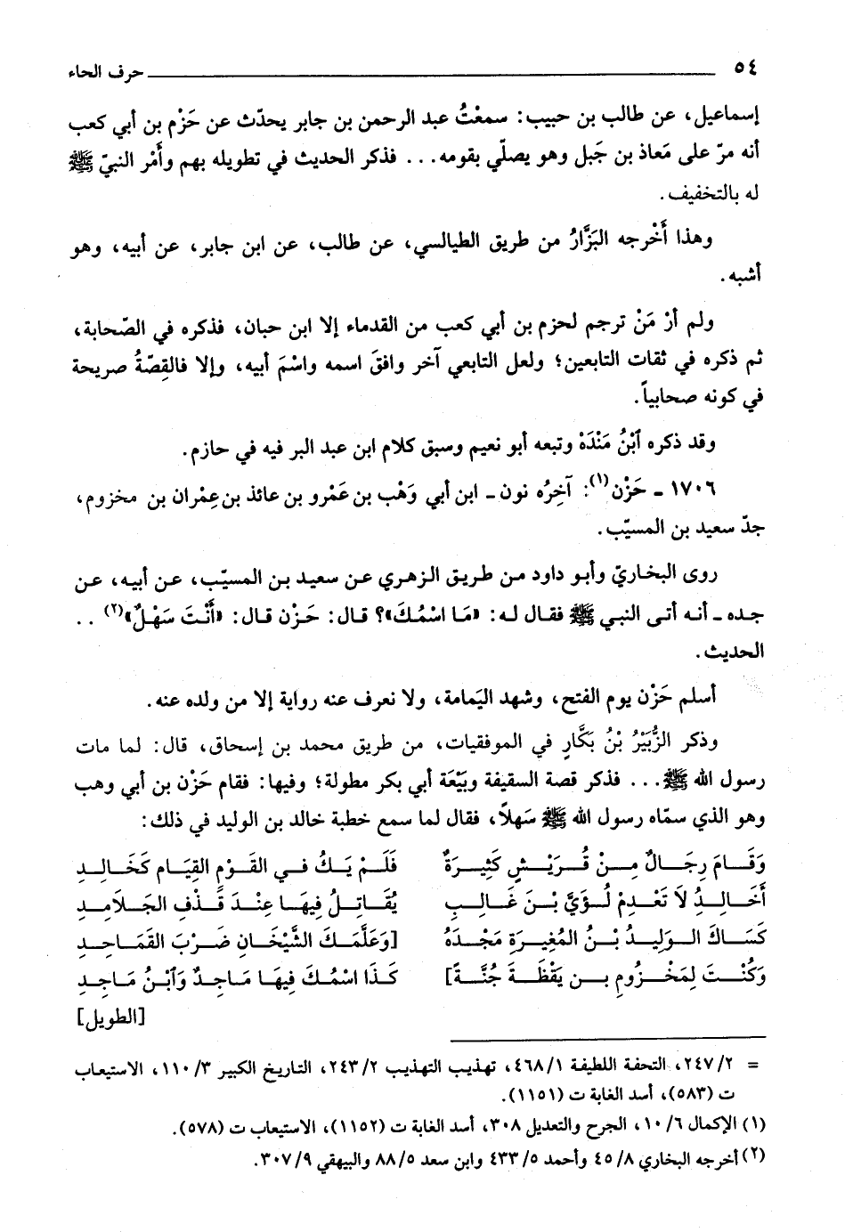إسماعيل، عن طالب بن حبيب: سمعت عبد الرحمن بن جابر يحدّث عن حزم بن أبي كعب أنه مرّ على معاذ بن جبل وهو يصلّي بقومه ... فذكر الحديث في تطويله بهم وأمر النبيّ صلّى اللَّه عليه وسلّم له بالتخفيف.