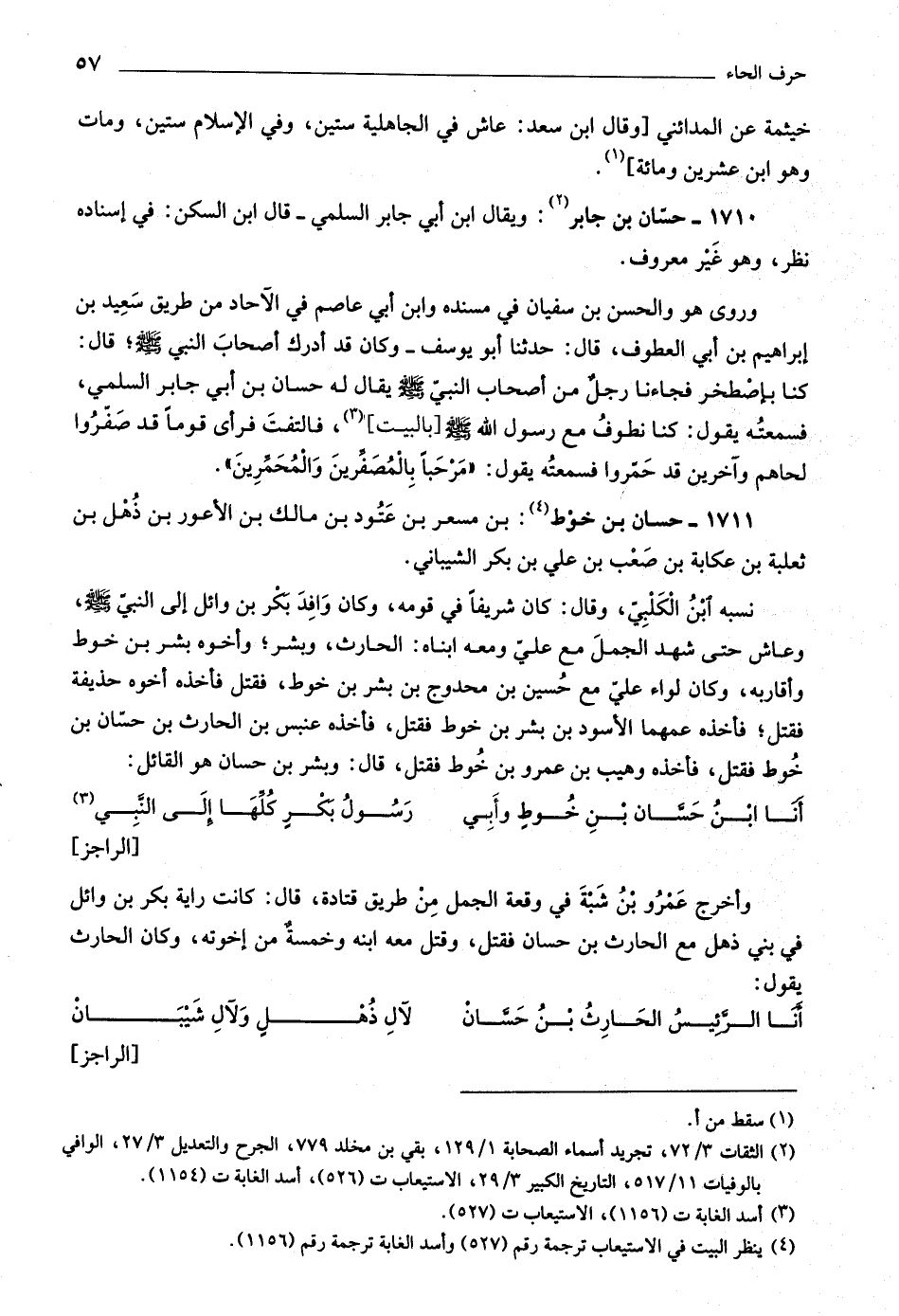 «٥» [الراجز] وأخرج عمرو بن شبة في وقعة الجمل من طريق قتادة، قال: كانت راية بكر بن وائل في بني ذهل مع الحارث بن حسان فقتل، وقتل معه ابنه وخمسة من إخوته، وكان الحارث يقول: