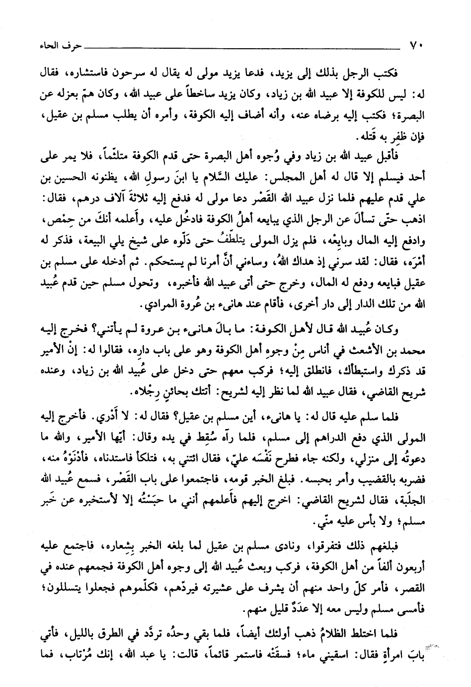 فلما سلم عليه قال له: يا هانئ، أين مسلم بن عقيل؟ فقال له: لا أدري. فأخرج إليه المولى الّذي دفع الدراهم إلى مسلم، فلما رآه سقط في يده وقال: أيّها الأمير، واللَّه ما دعوته إلى منزلي، ولكنه جاء فطرح نفسه عليّ، فقال ائتني به، فتلكأ فاستدناه، فأدنوه منه، فضربه بالقضيب وأمر بحبسه. فبلغ الخبر قومه، فاجتمعوا على باب القصر، فسمع عبيد اللَّه الجلبة، فقال لشريح القاضي: اخرج إليهم فأعلمهم أنني ما حبسته إلا لأستخبره عن خبر مسلم، ولا بأس عليه منّي.