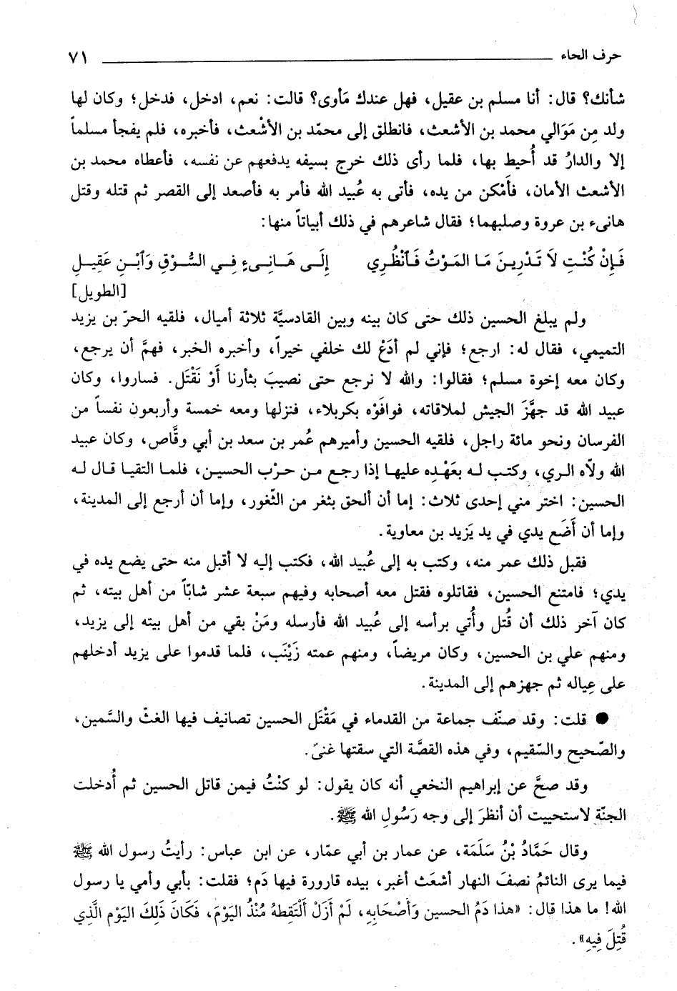 قلت: وقد صنّف جماعة من القدماء في مقتل الحسين تصانيف فيها الغثّ والسّمين، والصّحيح والسّقيم، وفي هذه القصّة التي سقتها غنى.