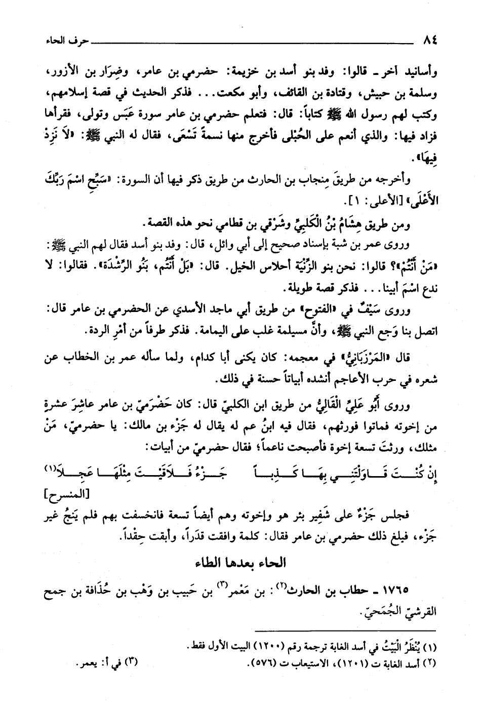 وأسانيد آخر- قالوا: وفد بنو أسد بن خزيمة: حضرمي بن عامر، وضرار بن الأزور، وسلمة بن حبيش، وقتادة بن القائف، وأبو مكعت ... فذكر الحديث في قصة إسلامهم، وكتب لهم رسول اللَّه صلّى اللَّه عليه وسلّم كتابا: قال: فتعلم حضرمي بن عامر سورة عبس وتولى، فقرأها فزاد فيها: والّذي أنعم على الحبلى فأخرج منها نسمة تسعى، فقال له النبي صلّى اللَّه عليه وسلّم: «لا نزد فيها» .