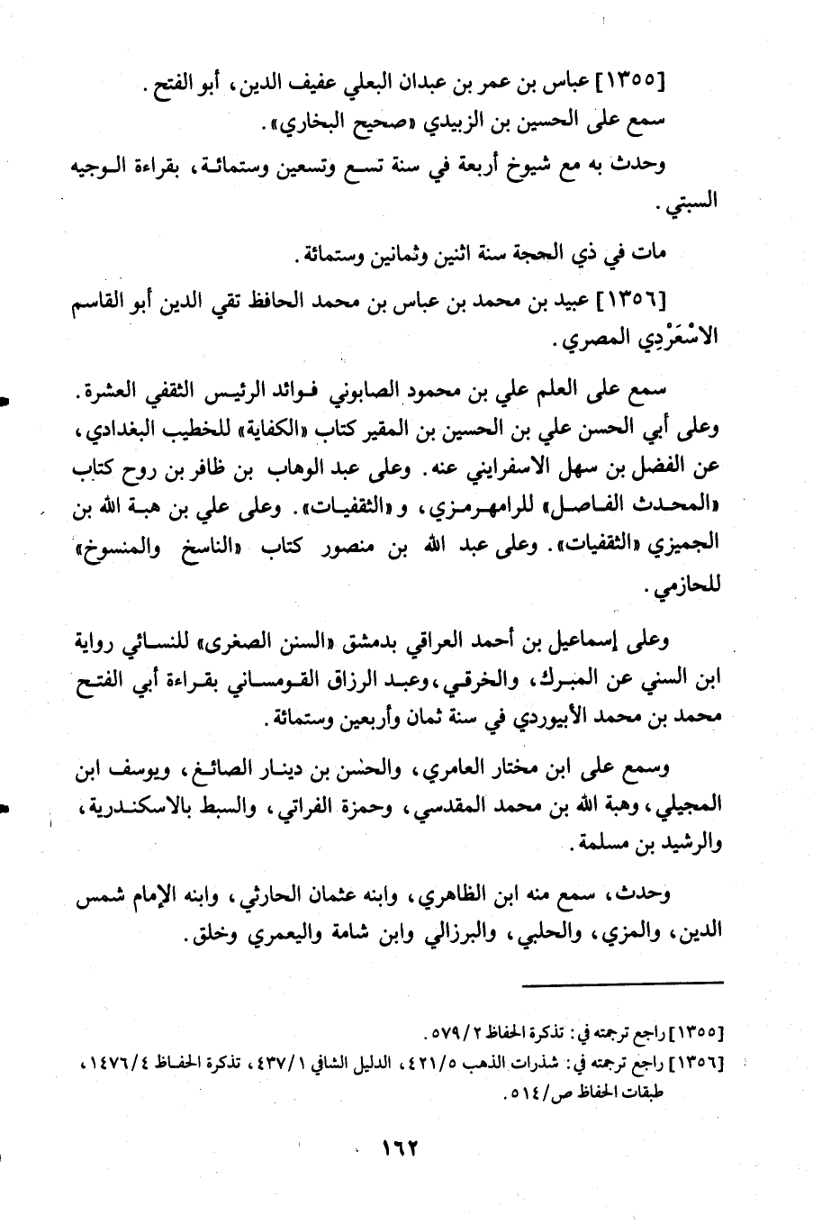 1355- عباس بن عمر بن عبدان البعلي عفيف الدين أبو الفتح سمع على الحسين بن الزبيدي "صحيح البخاري" وحدث به مع شيوخ اربعة في سنة تسع وتسعين وستمائة بقراءة الوجيه السبتي.