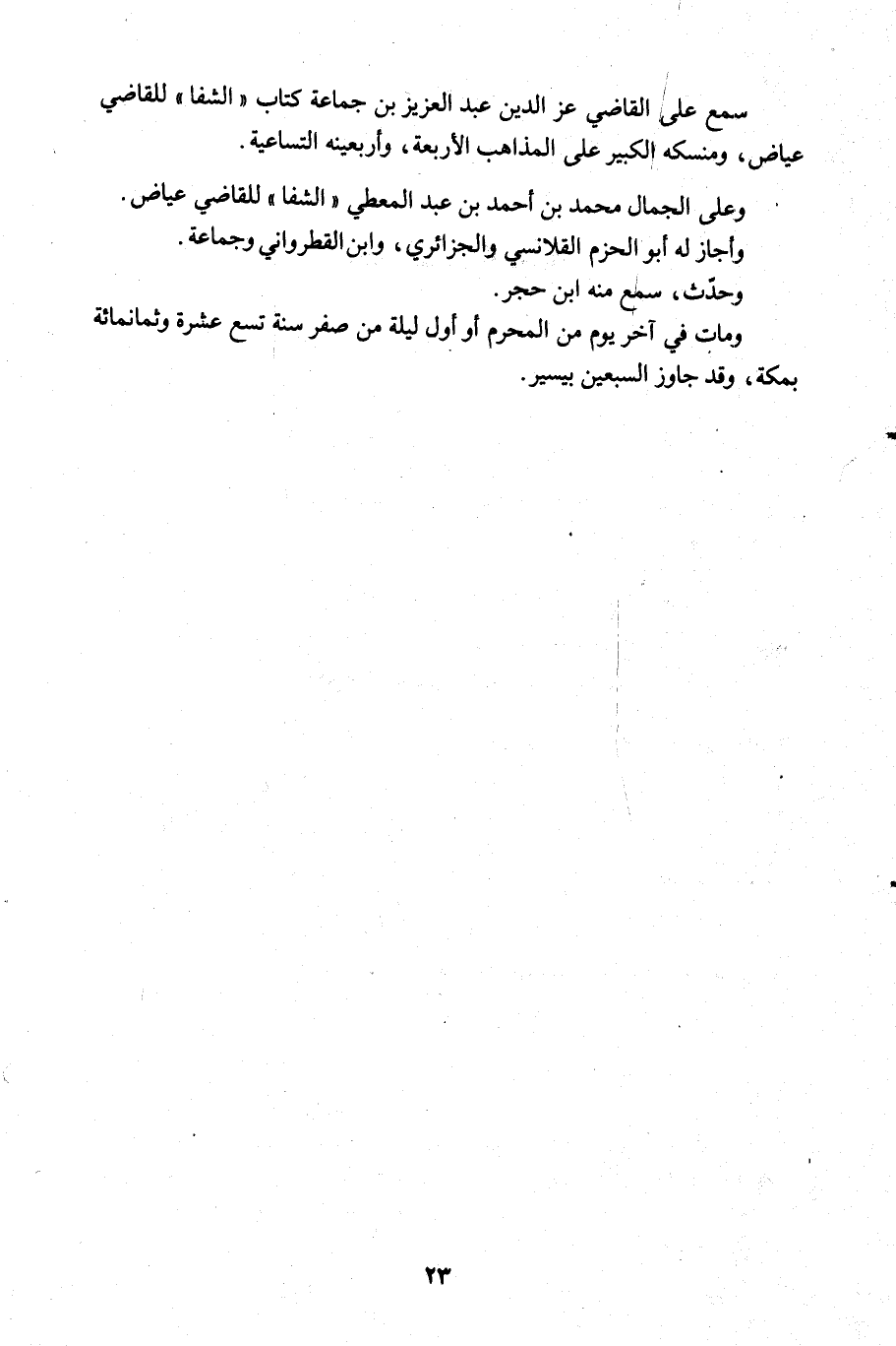 ومات في آخر يوم من المحرم أو أول ليلة من صفر سنة تسع عشرة وثمانمائة بمكة وقد جاوز السبعين بيسير.