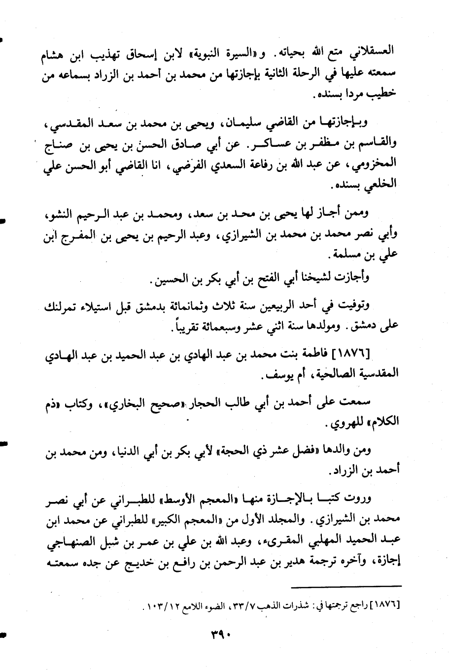 العسقلاني متع الله بحياته والسيرة النبوية لابن إسحاق تهذيب ابن هشام سمعته عليها في الرحلة الثانية بإجازتها من محمد بن أحمد بن الزراد بسماعه من خطيب مردا بسنده.