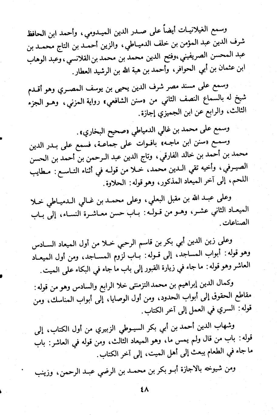 وسمع "سنن ابن ماجه" بافوات على جماعة فسمع على بدر الدين محمد بن أحمد بن خالد الفارقي وتاج الدين عبد الرحمن بن أحمد بن الحسن الصيرفي وأخيه تقي الدين محمد خلا من قوله في أثناء التاسع مطايب اللحم إلى آخر الميعاد المذكور وهو قوله الحلاوة.