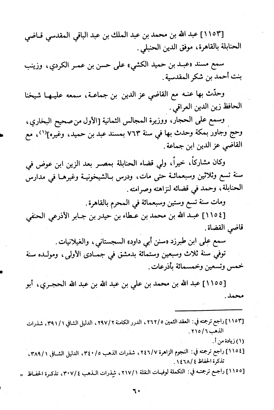 1153- عبد الله بن محمد بن عبد الملك بن عبد الباقي المقدسي قاضي الحنابلة بالقاهرة موفق الدين الحنبلي. سمع مسند عبد بن حميد الكشي على حسن بن عمر الكردي وزينب بنت أحمد بن شكر المقدسية.