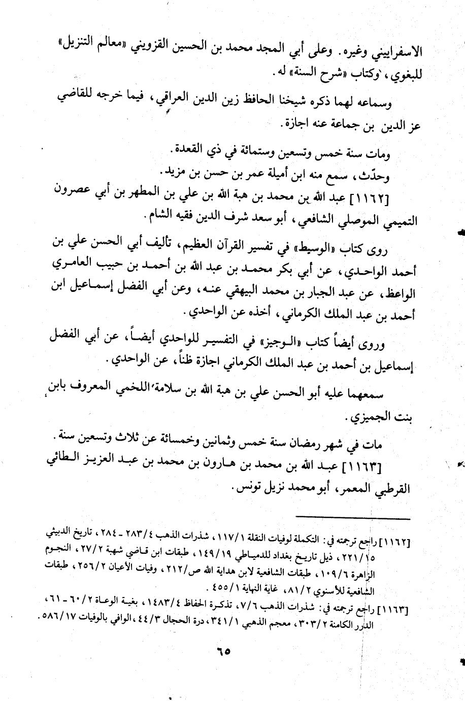 1162- راجع ترجمته في: التكملة لوفيات النقلة 1/117, شذرات الذهب 4/283- 284, تاريخ الدبيثي 15/221, ذيل تاريخ بغداد للدمياطي 19/149, طبقات ابن قاضي شهبة 2/27, النجوم الزاهرة 6/109, طبقات الشافعية لابن هداية الله ص 212, وفيات الأعيان 2/256, طبقات الشافعية للأسنوي 2/81, غاية النهاية 1/455.
