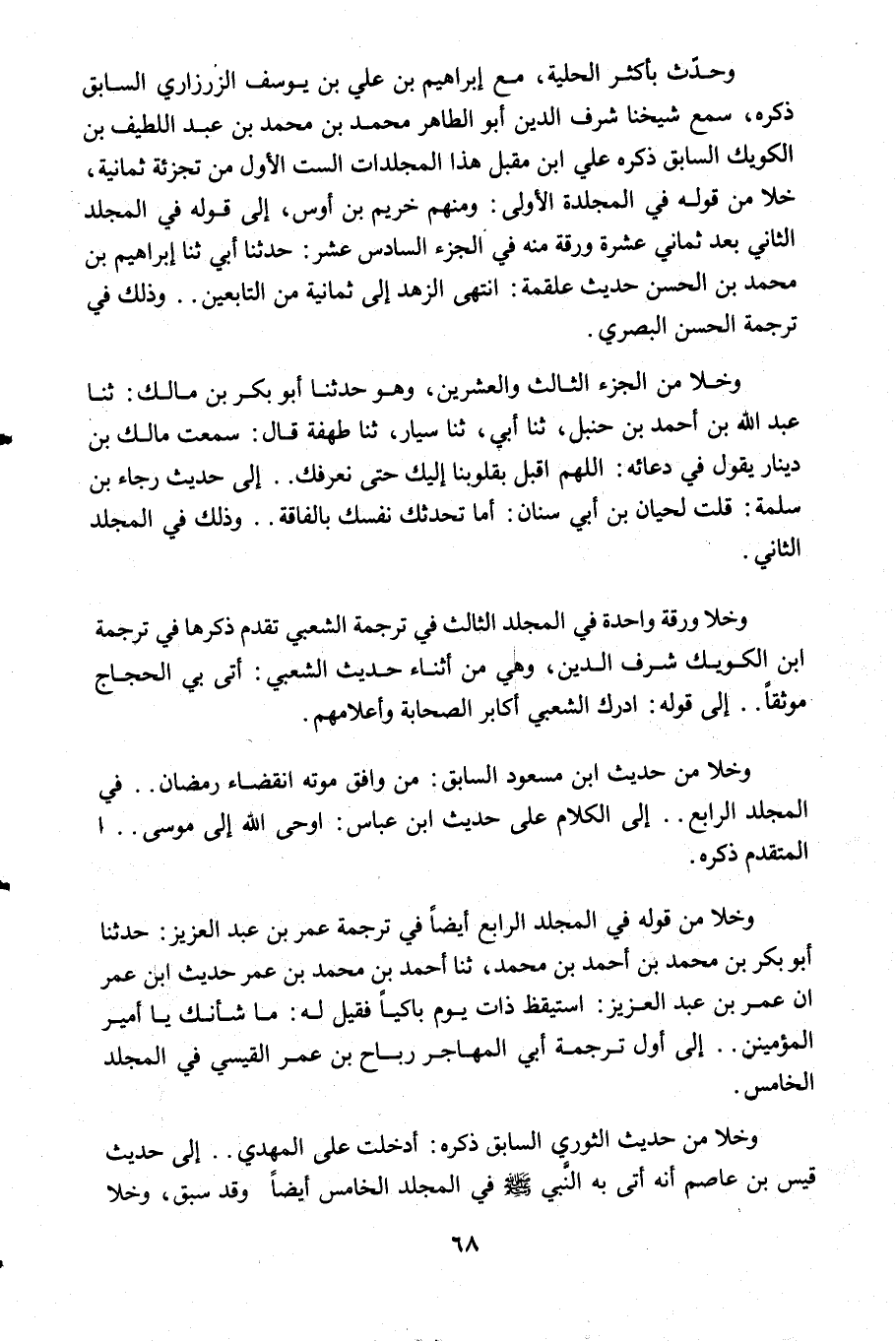 وخلا ورقة واحدة في المجلد الثالث في ترجمة الشعبي تقدم ذكرها في ترجمة ابن الكويك شرف الدين وهي من أثناء حديث الشعبي أتى بي الحجاج موثقا إلى قوله أدرك الشعبي أكابر الصحابة وأعلامهم.