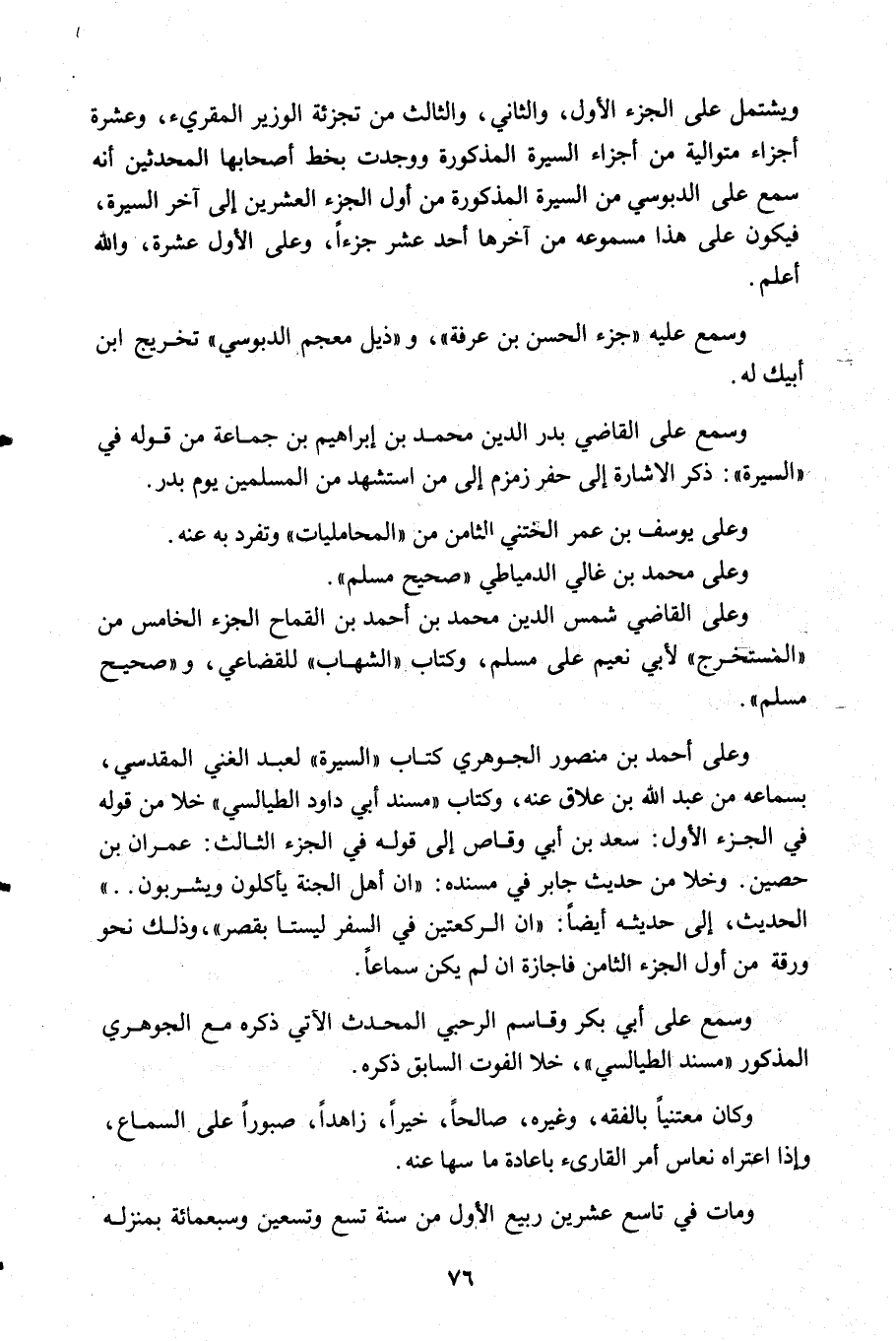 ويشتمل على الجز الأول والثاني والثالث من تجزئة الوزير المقرىء وعشرة أجزاء متوالية من أجزاء السيرة المذكورة ووجدت بخط أصحابها المحدثين أنه سمع على الدبوسي من السيرة المذكورة من أول الجزء العشرين إلى آخر السيرة فيكون على هذا مسموعه من آخرها أحد عشر جزءا وعلى الأول عشرة والله أعلم.