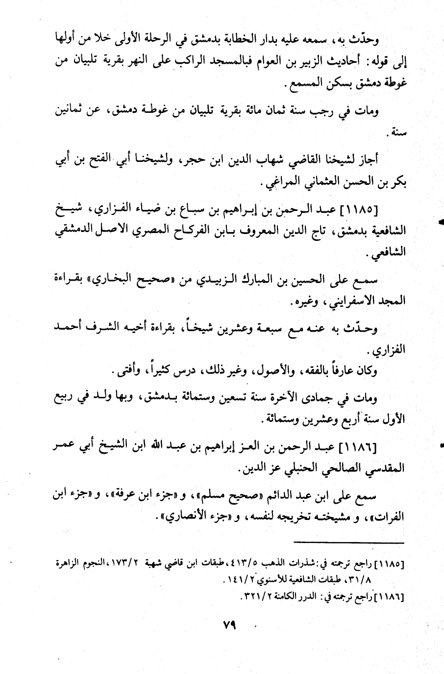 1186- عبد الرحمن بن العز إبراهيم بن عبد الله ابن الشيخ أبي عمر المقدسي الصالحي الحنبلي عز الدين. سمع على ابن عبد الدائم "صحيح مسلم" وجزء ابن عرفة وجزء ابن الفرات ومشيخته تخريجه لنفسه وجزء الأنصاري.