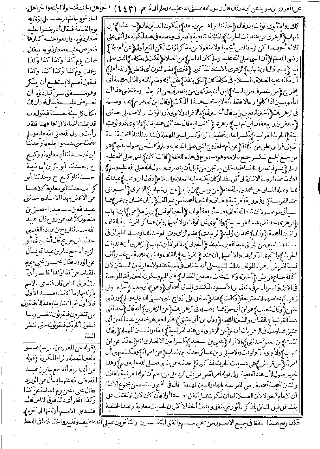 850 - وَقَالَ ابْنُ أَبِي مَرْيَمَ أَخْبَرَنَا نَافِعُ بْنُ يَزِيدَ قَالَ: أَخْبَرَنِي جَعْفَرُ بْنُ رَبِيعَةَ أَنَّ ابْنَ شِهَابٍ كَتَبَ إِلَيْهِ قَالَ: حَدَّثَتْنِي هِنْدُ بِنْتُ الْحَارِثِ الْفِرَاسِيَّةُ عَنْ أُمِّ سَلَمَةَ زَوْجِ النَّبِيِّ -صَلَّى اللَّهُ عَلَيْهِ وَسَلَّمَ-وَكَانَتْ مِنْ صَوَاحِبَاتِهَا- قَالَتْ: "كَانَ يُسَلِّمُ فَيَنْصَرِفُ النِّسَاءُ فَيَدْخُلْنَ بُيُوتَهُنَّ مِنْ قَبْلِ أَنْ يَنْصَرِفَ رَسُولُ اللَّهِ -صَلَّى اللَّهُ عَلَيْهِ وَسَلَّمَ-". وَقَالَ ابْنُ وَهْبٍ عَنْ يُونُسَ عَنِ ابْنِ شِهَابٍ أَخْبَرَتْنِي هِنْدُ الْفِرَاسِيَّةُ. وَقَالَ عُثْمَانُ بْنُ عُمَرَ أَخْبَرَنَا يُونُسُ عَنِ الزُّهْرِيِّ حَدَّثَتْنِي هِنْدُ الْفِرَاسِيَّةُ. وَقَالَ الزُّبَيْدِيُّ أَخْبَرَنِي الزُّهْرِيُّ أَنَّ هِنْدَ بِنْتَ الْحَارِثِ الْقُرَشِيَّةَ أَخْبَرَتْهُ -وَكَانَتْ تَحْتَ مَعْبَدِ بْنِ الْمِقْدَادِ وَهْوَ حَلِيفُ بَنِي زُهْرَةَ- وَكَانَتْ تَدْخُلُ عَلَى أَزْوَاجِ النَّبِيِّ -صَلَّى اللَّهُ عَلَيْهِ وَسَلَّمَ-. وَقَالَ شُعَيْبٌ عَنِ الزُّهْرِيِّ حَدَّثَتْنِي هِنْدُ الْقُرَشِيَّةُ. وَقَالَ ابْنُ أَبِي عَتِيقٍ عَنِ الزُّهْرِيِّ عَنْ هِنْدٍ الْفِرَاسِيَّةِ. وَقَالَ اللَّيْثُ حَدَّثَنِي يَحْيَى بْنُ سَعِيدٍ حَدَّثَهُ عَنِ ابْنِ شِهَابٍ عَنِ امْرَأَةٍ مِنْ قُرَيْشٍ حَدَّثَتْهُ عَنِ النَّبِيِّ -صَلَّى اللَّهُ عَلَيْهِ وَسَلَّمَ-".