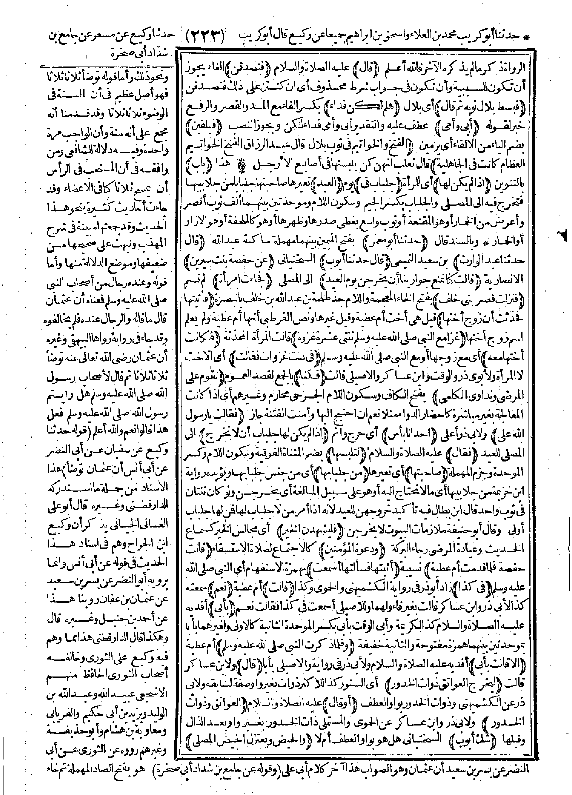 980 - حَدَّثَنَا أَبُو مَعْمَرٍ قَالَ: حَدَّثَنَا عَبْدُ الْوَارِثِ قَالَ: حَدَّثَنَا أَيُّوبُ عَنْ حَفْصَةَ بِنْتِ سِيرِينَ قَالَتْ: "كُنَّا نَمْنَعُ جَوَارِيَنَا أَنْ يَخْرُجْنَ يَوْمَ الْعِيدِ، فَجَاءَتِ امْرَأَةٌ فَنَزَلَتْ قَصْرَ بَنِي خَلَفٍ، فَأَتَيْتُهَا، فَحَدَّثَتْ أَنَّ زَوْجَ أُخْتِهَا غَزَا مَعَ النَّبِيِّ -صَلَّى اللَّهُ عَلَيْهِ وَسَلَّمَ- ثِنْتَىْ عَشْرَةَ غَزْوَةً، فَكَانَتْ أُخْتُهَا مَعَهُ فِي سِتِّ غَزَوَاتٍ، فَقَالَتْ: فَكُنَّا نَقُومُ عَلَى الْمَرْضَى، وَنُدَاوِي الْكَلْمَى. فَقَالَتْ: يَا رَسُولَ اللَّهِ، عَلَى إِحْدَانَا بَأْسٌ -إِذَا لَمْ يَكُنْ لَهَا جِلْبَابٌ- أَنْ لاَ تَخْرُجَ؟ فَقَالَ: «لِتُلْبِسْهَا صَاحِبَتُهَا مِنْ جِلْبَابِهَا، فَلْيَشْهَدْنَ الْخَيْرَ وَدَعْوَةَ الْمُؤْمِنِينَ». قَالَتْ حَفْصَةُ: فَلَمَّا قَدِمَتْ أُمُّ عَطِيَّةَ أَتَيْتُهَا فَسَأَلْتُهَا: أَسَمِعْتِ فِي كَذَا وَكَذَا؟ قَالَتْ: نَعَمْ، بِأَبِي -وَقَلَّمَا ذَكَرَتِ النَّبِيَّ -صَلَّى اللَّهُ عَلَيْهِ وَسَلَّمَ- إِلاَّ قَالَتْ بِأَبِي- قَالَ: «لِيَخْرُجِ الْعَوَاتِقُ ذَوَاتُ الْخُدُورِ -أَوْ قَالَ الْعَوَاتِقُ وَذَوَاتُ الْخُدُورِ، شَكَّ أَيُّوبُ- وَالْحُيَّضُ، وَيَعْتَزِلُ الْحُيَّضُ الْمُصَلَّى، وَلْيَشْهَدْنَ الْخَيْرَ وَدَعْوَةَ الْمُؤْمِنِينَ». قَالَتْ: فَقُلْتُ لَهَا: آلْحُيَّضُ؟ قَالَتْ: نَعَمْ، أَلَيْسَ الْحَائِضُ تَشْهَدُ عَرَفَاتٍ وَتَشْهَدُ كَذَا وَتَشْهَدُ كَذَا؟ ".