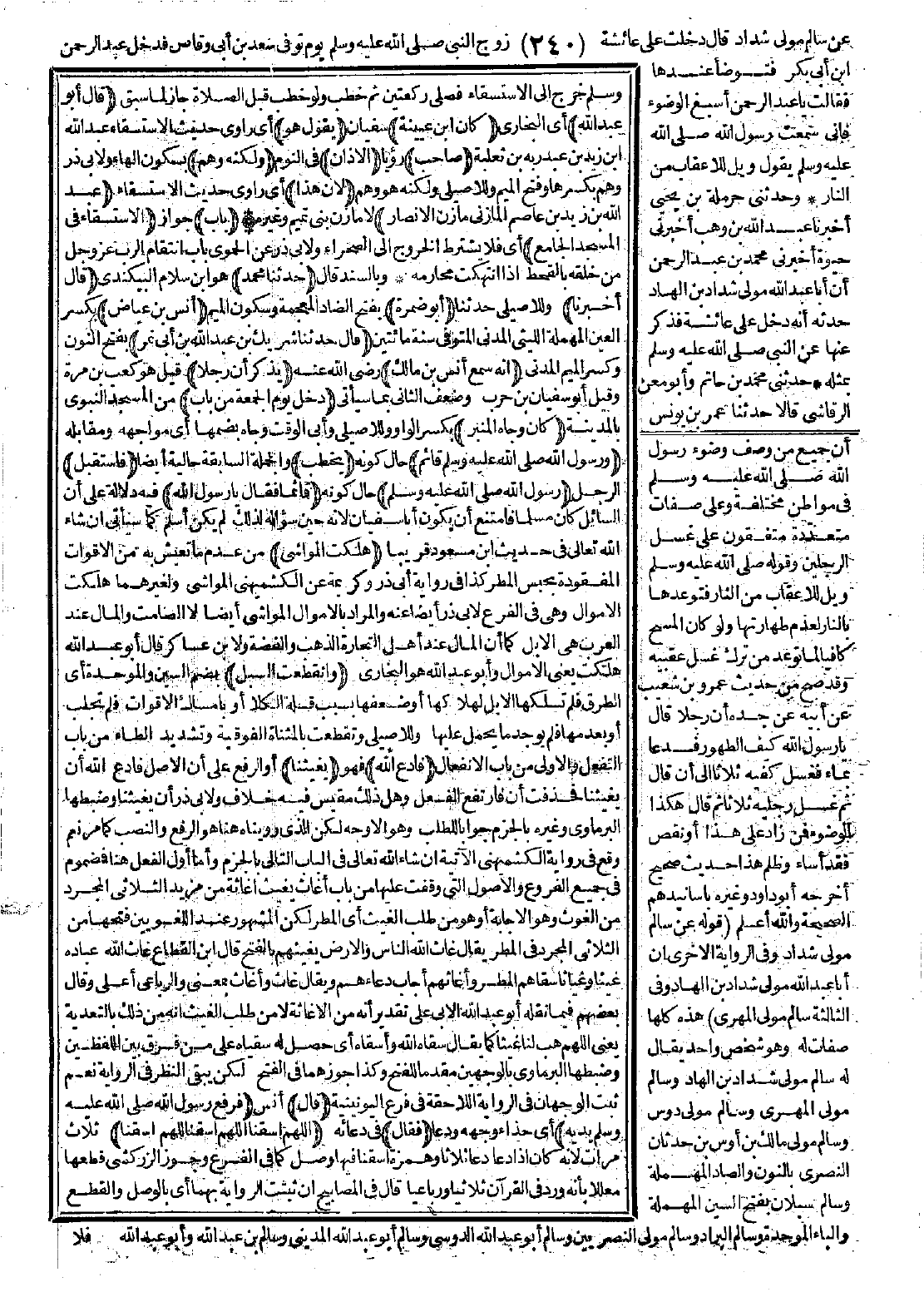 وَمَا بَيْنَنَا وَبَيْنَ سَلْعٍ مِنْ بَيْتٍ وَلاَ دَارٍ. قَالَ: فَطَلَعَتْ مِنْ وَرَائِهِ سَحَابَةٌ مِثْلُ التُّرْسِ. فَلَمَّا تَوَسَّطَتِ السَّمَاءَ انْتَشَرَتْ، ثُمَّ أَمْطَرَتْ- قَالَ: وَاللَّهِ مَا رَأَيْنَا الشَّمْسَ سِتًّا. ثُمَّ دَخَلَ رَجُلٌ مِنْ ذَلِكَ الْبَابِ فِي الْجُمُعَةِ الْمُقْبِلَةِ -وَرَسُولُ اللَّهِ -صَلَّى اللَّهُ عَلَيْهِ وَسَلَّمَ- قَائِمٌ يَخْطُبُ- فَاسْتَقْبَلَهُ قَائِمًا فَقَالَ: يَا رَسُولَ اللَّهِ، هَلَكَتِ الأَمْوَالُ، وَانْقَطَعَتِ السُّبُلُ، فَادْعُ اللَّهَ يُمْسِكْهَا. قَالَ: فَرَفَعَ رَسُولُ اللَّهِ -صَلَّى اللَّهُ عَلَيْهِ وَسَلَّمَ- يَدَيْهِ ثُمَّ قَالَ: اللَّهُمَّ حَوَالَيْنَا وَلاَ عَلَيْنَا، اللَّهُمَّ عَلَى الإكَامِ وَالْجِبَالِ وَالظِّرَابِ وَالأَوْدِيَةِ وَمَنَابِتِ الشَّجَرِ». قَالَ: فَانْقَطَعَتْ، وَخَرَجْنَا نَمْشِي فِي الشَّمْسِ. قَالَ شَرِيكٌ: فَسَأَلْتُ أَنَسًا: أَهُوَ الرَّجُلُ الأَوَّلُ؟ قَالَ: لاَ أَدْرِي.