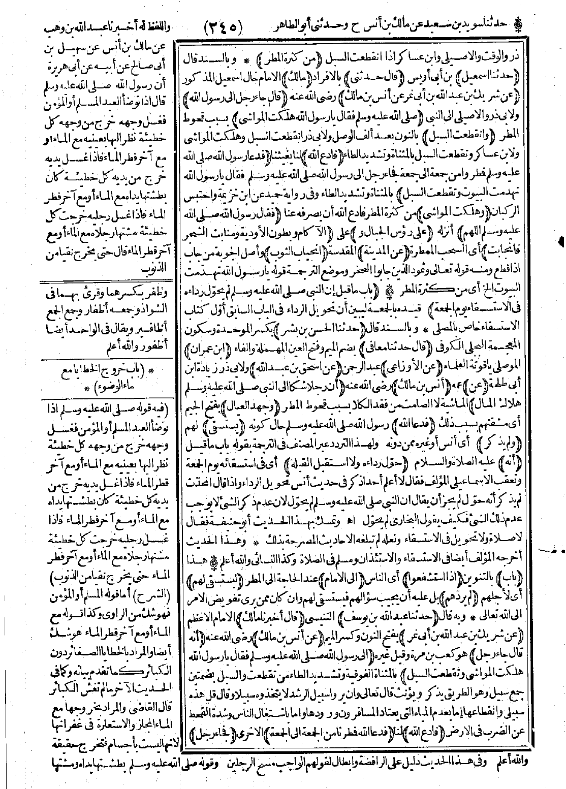 عَبْدِ اللَّهِ عَنْ أَنَسِ بْنِ مَالِكٍ: "أَنَّ رَجُلاً شَكَا إِلَى النَّبِيِّ -صَلَّى اللَّهُ عَلَيْهِ وَسَلَّمَ- هَلاَكَ الْمَالِ وَجَهْدَ الْعِيَالِ، فَدَعَا اللَّهَ يَسْتَسْقِي. وَلَمْ يَذْكُرْ أَنَّهُ حَوَّلَ رِدَاءَهُ، وَلاَ اسْتَقْبَلَ الْقِبْلَةَ".