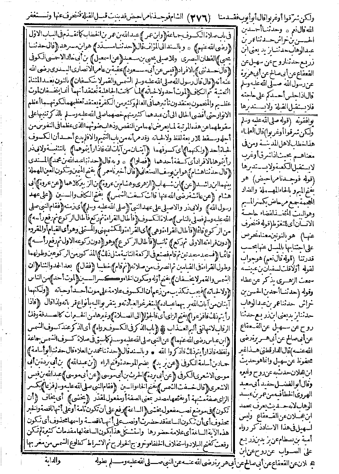 1058 - حَدَّثَنَا عَبْدُ اللَّهِ بْنُ مُحَمَّدٍ قَالَ: حَدَّثَنَا هِشَامٌ أَخْبَرَنَا مَعْمَرٌ عَنِ الزُّهْرِيِّ وَهِشَامِ بْنِ عُرْوَةَ عَنْ عُرْوَةَ عَنْ عَائِشَةَ -رضي الله عنها- قَالَتْ: "كَسَفَتِ الشَّمْسُ عَلَى عَهْدِ رَسُولِ اللَّهِ -صَلَّى اللَّهُ عَلَيْهِ وَسَلَّمَ- فَقَامَ النَّبِيُّ -صَلَّى اللَّهُ عَلَيْهِ وَسَلَّمَ- فَصَلَّى بِالنَّاسِ فَأَطَالَ الْقِرَاءَةَ، ثُمَّ رَكَعَ فَأَطَالَ الرُّكُوعَ، ثُمَّ رَفَعَ رَأْسَهُ فَأَطَالَ الْقِرَاءَةَ، وَهْيَ دُونَ قِرَاءَتِهِ