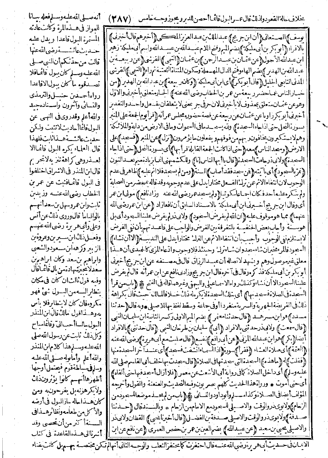1079 - حَدَّثَنَا صَدَقَةُ قَالَ: أَخْبَرَنَا يَحْيَى عَنْ عُبَيْدِ اللَّهِ عَنْ نَافِعٍ عَنِ ابْنِ عُمَرَ -رضي الله عنهما- قَالَ: "كَانَ النَّبِيُّ -صَلَّى اللَّهُ عَلَيْهِ وَسَلَّمَ- يَقْرَأُ السُّورَةَ الَّتِي فِيهَا السَّجْدَةُ، فَيَسْجُدُ وَنَسْجُدُ، حَتَّى مَا يَجِدُ أَحَدُنَا مَكَانًا لِمَوْضِعِ جَبْهَتِهِ".