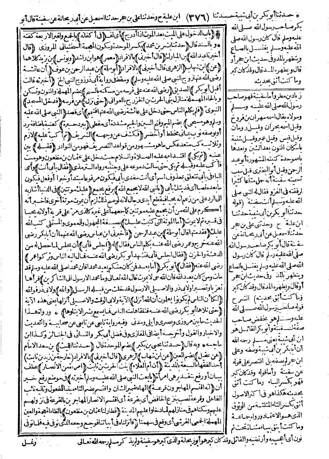 -رضي الله عنه- عَلَى فَرَسِهِ مِنْ مَسْكَنِهِ بِالسُّنْحِ حَتَّى نَزَلَ فَدَخَلَ الْمَسْجِدَ فَلَمْ يُكَلِّمِ النَّاسَ حَتَّى دَخَلَ عَلَى عَائِشَةَ -رضي الله عنها-، فَتَيَمَّمَ النَّبِيَّ -صَلَّى اللَّهُ عَلَيْهِ وَسَلَّمَ-وَهُوَ مُسَجًّى بِبُرْدِ حِبَرَةٍ- فَكَشَفَ عَنْ وَجْهِهِ، ثُمَّ أَكَبَّ عَلَيْهِ فَقَبَّلَهُ، ثُمَّ بَكَى فَقَالَ: بِأَبِي أَنْتَ يَا نَبِيَّ اللَّهِ، لاَ يَجْمَعُ اللَّهُ عَلَيْكَ مَوْتَتَيْنِ: أَمَّا الْمَوْتَةُ الَّتِي كُتِبَتْ عَلَيْكَ فَقَدْ مُتَّهَا". قَالَ أَبُو سَلَمَةَ: فَأَخْبَرَنِي ابْنُ عَبَّاسٍ -رضي الله عنهما- "أَنَّ أَبَا بَكْرٍ -رضي الله عنه- خَرَجَ وَعُمَرُ -رضي الله عنه- يُكَلِّمُ النَّاسَ، فَقَالَ: اجْلِسْ، فَأَبَى. فَقَالَ: اجْلِسْ، فَأَبَى. فَتَشَهَّدَ أَبُو بَكْرٍ -رضي الله عنه- فَمَالَ إِلَيْهِ النَّاسُ وَتَرَكُوا عُمَرَ، فَقَالَ: أَمَّا بَعْدُ فَمَنْ كَانَ مِنْكُمْ يَعْبُدُ مُحَمَّدًا -صَلَّى اللَّهُ عَلَيْهِ وَسَلَّمَ- فَإِنَّ مُحَمَّدًا -صَلَّى اللَّهُ عَلَيْهِ وَسَلَّمَ- قَدْ مَاتَ، وَمَنْ كَانَ يَعْبُدُ اللَّهَ فَإِنَّ اللَّهَ حَيٌّ لاَ يَمُوتُ، قَالَ اللَّهُ تَعَالَى: {وَمَا مُحَمَّدٌ إِلاَّ رَسُولٌ -إِلَى- الشَّاكِرِينَ} [آل عمران: 144] وَاللَّهِ لَكَأَنَّ النَّاسَ لَمْ يَكُونُوا يَعْلَمُونَ أَنَّ اللَّهَ أَنْزَلَ الآيَةَ حَتَّى تَلاَهَا أَبُو بَكْرٍ -رضي الله عنه-، فَتَلَقَّاهَا مِنْهُ النَّاسُ، فَمَا يُسْمَعُ بَشَرٌ إِلاَّ يَتْلُوهَا". [الحديث 1241 - أطرافه في: 3667، 3669، 4452،