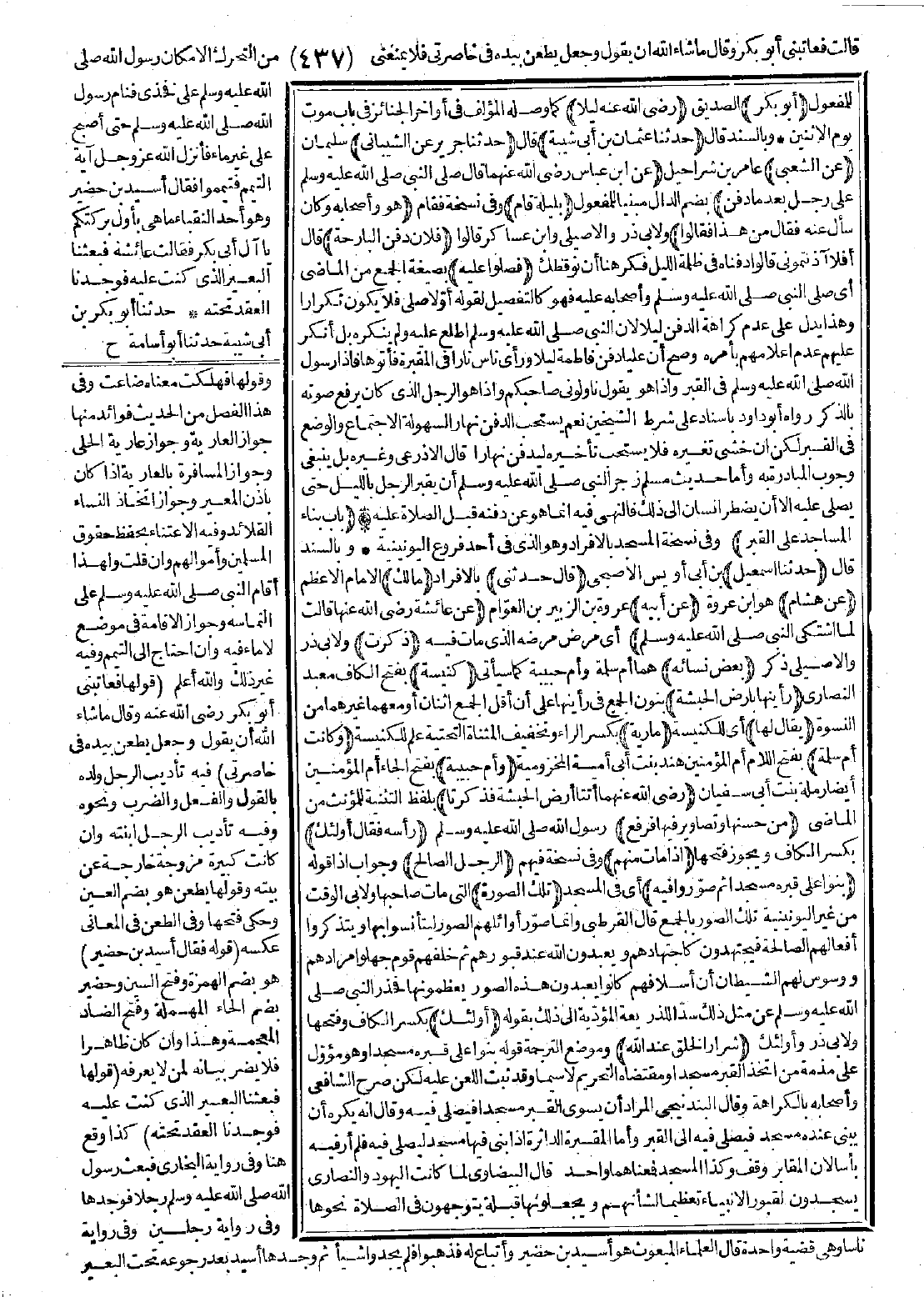 فَقَالَ: أُولَئِكَ إِذَا مَاتَ مِنْهُمُ الرَّجُلُ الصَّالِحُ بَنَوْا عَلَى قَبْرِهِ مَسْجِدًا ثُمَّ صَوَّرُوا فِيهِ تِلْكَ الصُّورَةَ، أُولَئِكَ شِرَارُ الْخَلْقِ عِنْدَ اللَّهِ".