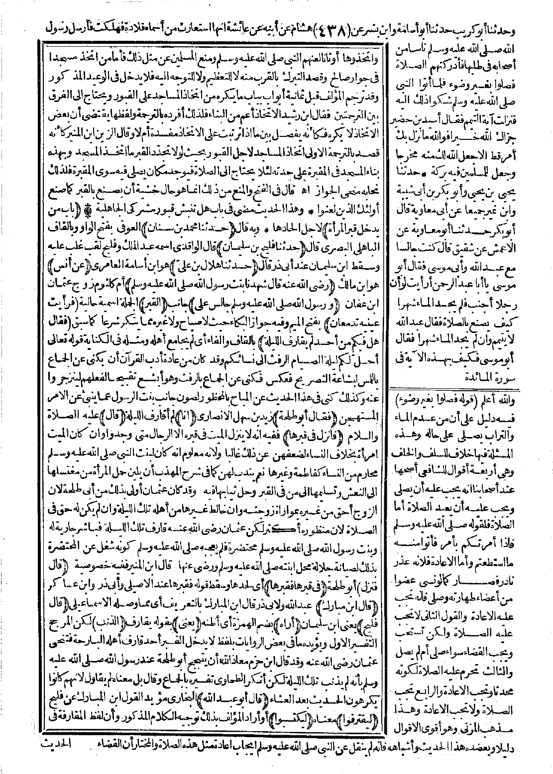 وقد ترجم المؤلّف، قبل ثمانية أبواب، بباب: ما يكره من اتخاذ المساجد على القبور، ويحتاج إلى الفرق بين الترجمين، فقال ابن رشيد: الاتخاذ أعم من البناء، فلذلك أفرده بالترجمة، ولفظها يقتضي أن بعض الاتخاذ لا يكره، فكأنه يفصل بين ما إذا ترتبت على الاتخاذ مفسدة أم لا. وقال الزين بن المنير: كأنه قصد بالترجمة الأولى اتخاذ المساجد لأجل القبور، بحيث لولا تجدّد القبر ما اْتخذ المسجد، وبهذه بناء المسجد في المقبرة على حدته، لئلا يحتاج إلى الصلاة، فيوجد مكان يصلّي فيه سوى المقبرة، فلذلك نحا به منحى الجواز. اهـ. قال في الفتح: والمنع من ذلك إنما هو حال خشية أن يصنع بالقبر كما صنع أولئك الذين لعنوا.