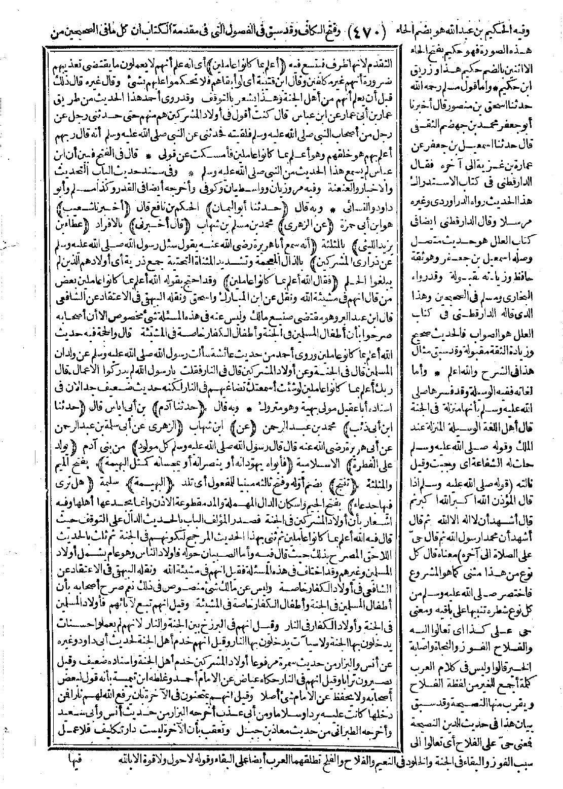 ونقل عن ابن المبارك وإسحاق ونقله البيهقي في الاعتقاد، عن الشافعي. قال ابن عبد البر: وهو مقتضى صنيع مالك، وليس عنه في هذه المسألة شيء مخصوص، إلا أن أصحابه صرحوا بأن أطفال المسلمين في الجنة، وأطفال الكفار خاصة في المشيئة. قال: والحجة فيه حديث: الله أعلم بما كانوا عاملين. وروى أحمد، من حديث عائشة: سألت رسول الله -صَلَّى اللَّهُ عَلَيْهِ وَسَلَّمَ-، عن ولدان المسلمين؟ قال: في الجنة، وعن أولاد المشركين؟ قال في النار. فقلت يا رسول الله لم يدركوا الأعمال! قال: ربك أعلم بما كانوا عاملين، لو شئت أسمعتك تضاغيهم في النار. لكنه حديث ضعيف جدًّا لأن في إسناده أبا عقيل مولى بهية، وهو متروك.