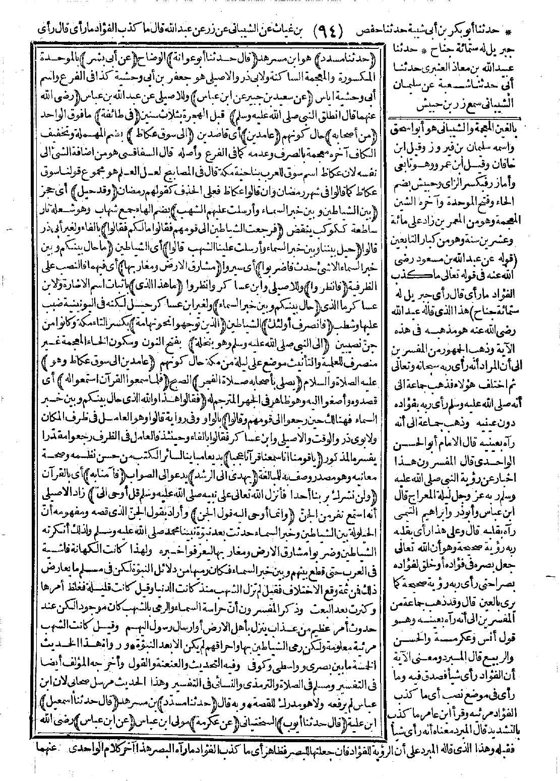 773 - حَدَّثَنَا مُسَدَّدٌ قَالَ: حَدَّثَنَا أَبُو عَوَانَةَ عَنْ أَبِي بِشْرٍ عَنْ سَعِيدِ بْنِ جُبَيْرٍ عَنِ ابْنِ عَبَّاسٍ -رضي الله عنهما- قَالَ: "انْطَلَقَ النَّبِيُّ -صَلَّى اللَّهُ عَلَيْهِ وَسَلَّمَ- فِي طَائِفَةٍ مِنْ أَصْحَابِهِ عَامِدِينَ إِلَى سُوقِ عُكَاظٍ، وَقَدْ حِيلَ بَيْنَ الشَّيَاطِينِ وَبَيْنَ خَبَرِ السَّمَاءِ، وَأُرْسِلَتْ عَلَيْهِمُ الشُّهُبُ، فَرَجَعَتِ الشَّيَاطِينُ إِلَى قَوْمِهِمْ فَقَالُوا: مَا لَكُمْ؟ فَقَالُوا: حِيلَ بَيْنَنَا وَبَيْنَ خَبَرِ السَّمَاءِ، وَأُرْسِلَتْ عَلَيْنَا الشُّهُبُ. قَالُوا: مَا حَالَ بَيْنَكُمْ وَبَيْنَ خَبَرِ السَّمَاءِ إِلاَّ شَىْءٌ حَدَثَ، فَاضْرِبُوا مَشَارِقَ الأَرْضِ وَمَغَارِبَهَا فَانْظُرُوا مَا هَذَا الَّذِي حَالَ بَيْنَكُمْ وَبَيْنَ خَبَرِ السَّمَاءِ. فَانْصَرَفَ أُولَئِكَ الَّذِينَ تَوَجَّهُوا نَحْوَ تِهَامَةَ إِلَى النَّبِيِّ -صَلَّى اللَّهُ عَلَيْهِ وَسَلَّمَ- وَهْوَ بِنَخْلَةَ عَامِدِينَ إِلَى سُوقِ عُكَاظٍ وَهْوَ يُصَلِّي بِأَصْحَابِهِ صَلاَةَ الْفَجْرِ، فَلَمَّا سَمِعُوا الْقُرْآنَ اسْتَمَعُوا لَهُ فَقَالُوا: هَذَا وَاللَّهِ الَّذِي حَالَ بَيْنَكُمْ وَبَيْنَ خَبَرِ السَّمَاءِ. فَهُنَالِكَ حِينَ رَجَعُوا إِلَى قَوْمِهِمْ وَقَالُوا: {يَا قَوْمَنَا إِنَّا سَمِعْنَا قُرْآنًا عَجَبًا * يَهْدِي إِلَى الرُّشْدِ فَآمَنَّا بِهِ وَلَنْ نُشْرِكَ بِرَبِّنَا أَحَدًا} فَأَنْزَلَ اللَّهُ عَلَى نَبِيِّهِ -صَلَّى اللَّهُ عَلَيْهِ وَسَلَّمَ-: {قُلْ أُوحِيَ إِلَىَّ} وَإِنَّمَا أُوحِيَ إِلَيْهِ قَوْلُ الْجِنِّ". [الحديث 773 - طرفه في: 4921].