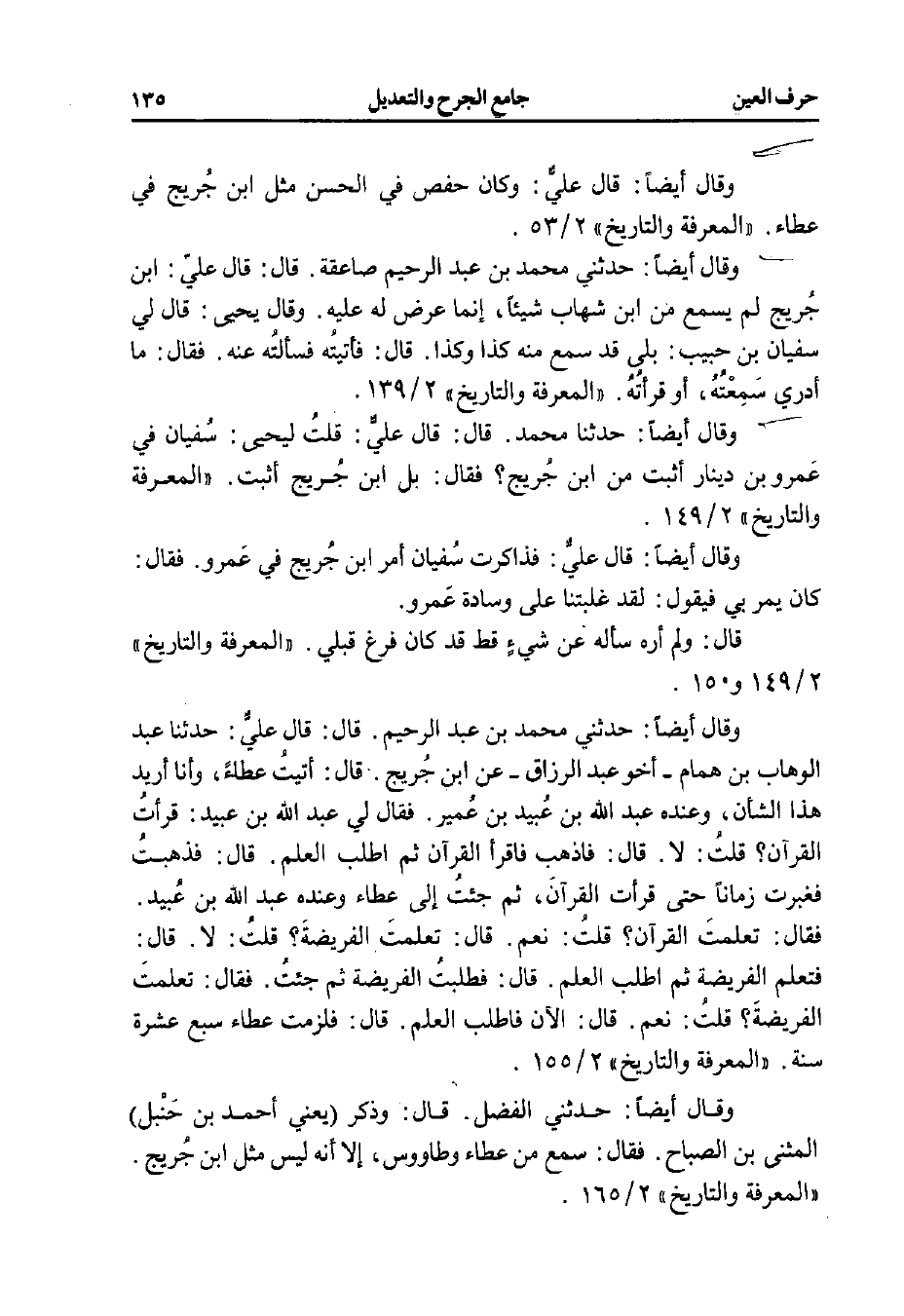 وقال أيضًا: قال علي: فذاكرت سفيان أمر ابن جُريج في عَمرو. فقال: كان يمر بي فيقول: لقد غلبتنا على وسادة عَمرو.