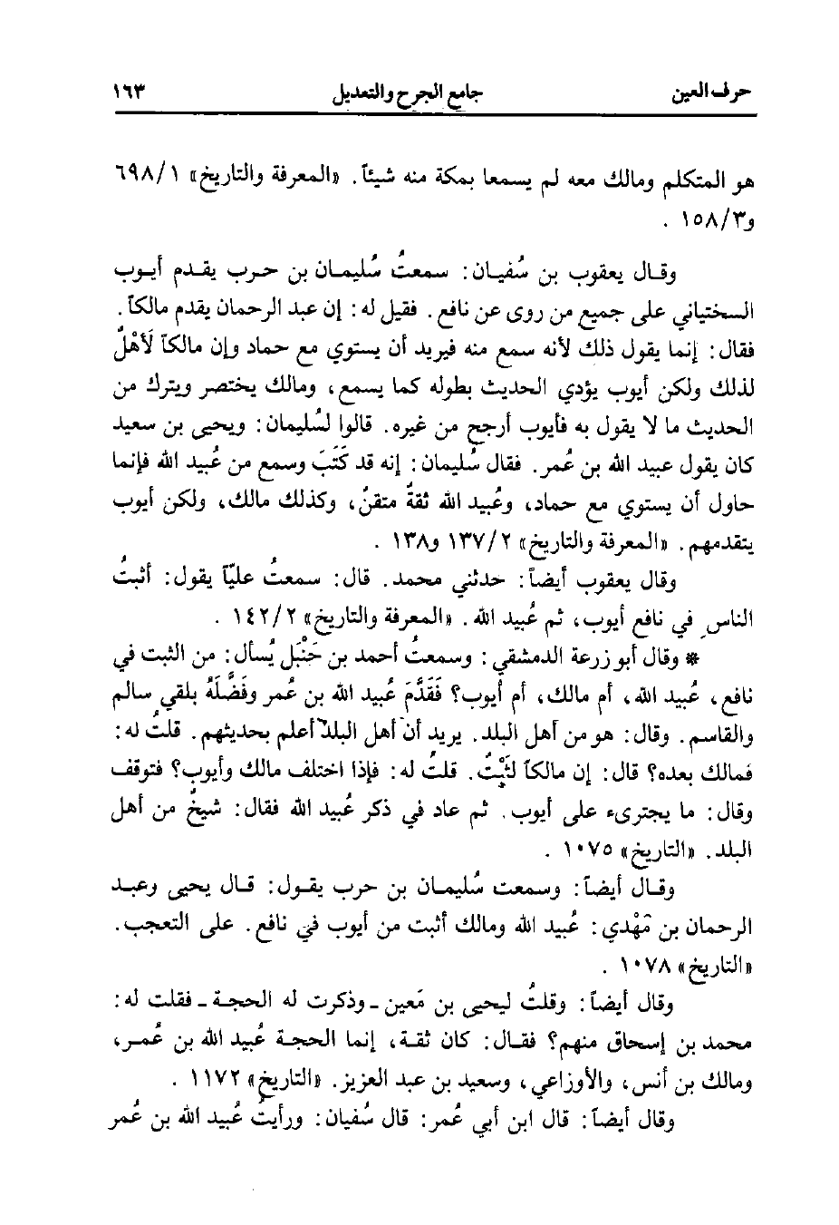 وقال يعقوب بن سُفيان: سمعتُ سُليمان بن حرب يقدم أيوب السختياني على جميع من روى عن نافع. فمل له: إن عبد الرحمن يقدم مالكًا. فقال: إنما يقول ذلك لأنه سمع منه فيريد أن يستوي مع حماد وإن مالكًا لَأهْلٌ لذلك ولكن أيوب يؤدي الحديث بطوله كما يسمع، ومالك يختصر ويترك من الحديث ما لا يقول به فأيوب أرجح من غيره. قالوا لسُليمان: ويحيى بن سعيد كان بقول عبيد الله بن عُمر. فقال سُليمان: إنه قد كَتَبَ وسمع من عُبيد الله فإنما حاول أن يستوي مع حماد، وعُبيد الله ثقةٌ متقنٌ، وكذلك مالك، ولكن أيوب يتقدمهم. "المعرفة والتاريخ" 2/ 137 و 138.