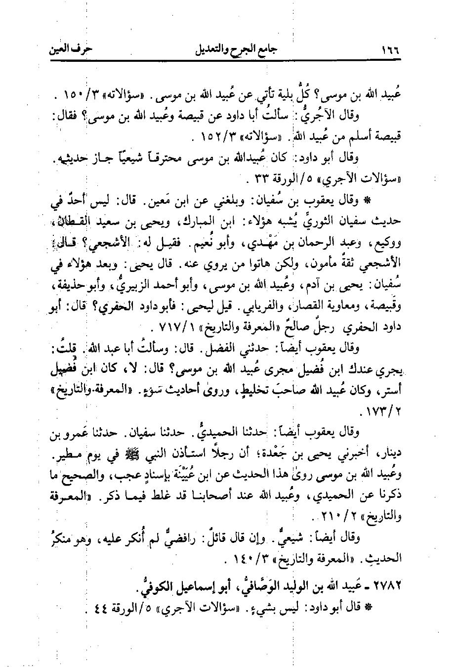 عُبيد الله بن موسى؟ كُلُّ بلية تأتي عن عُبيد الله بن موسى. "سؤالاته" 3/ 150.