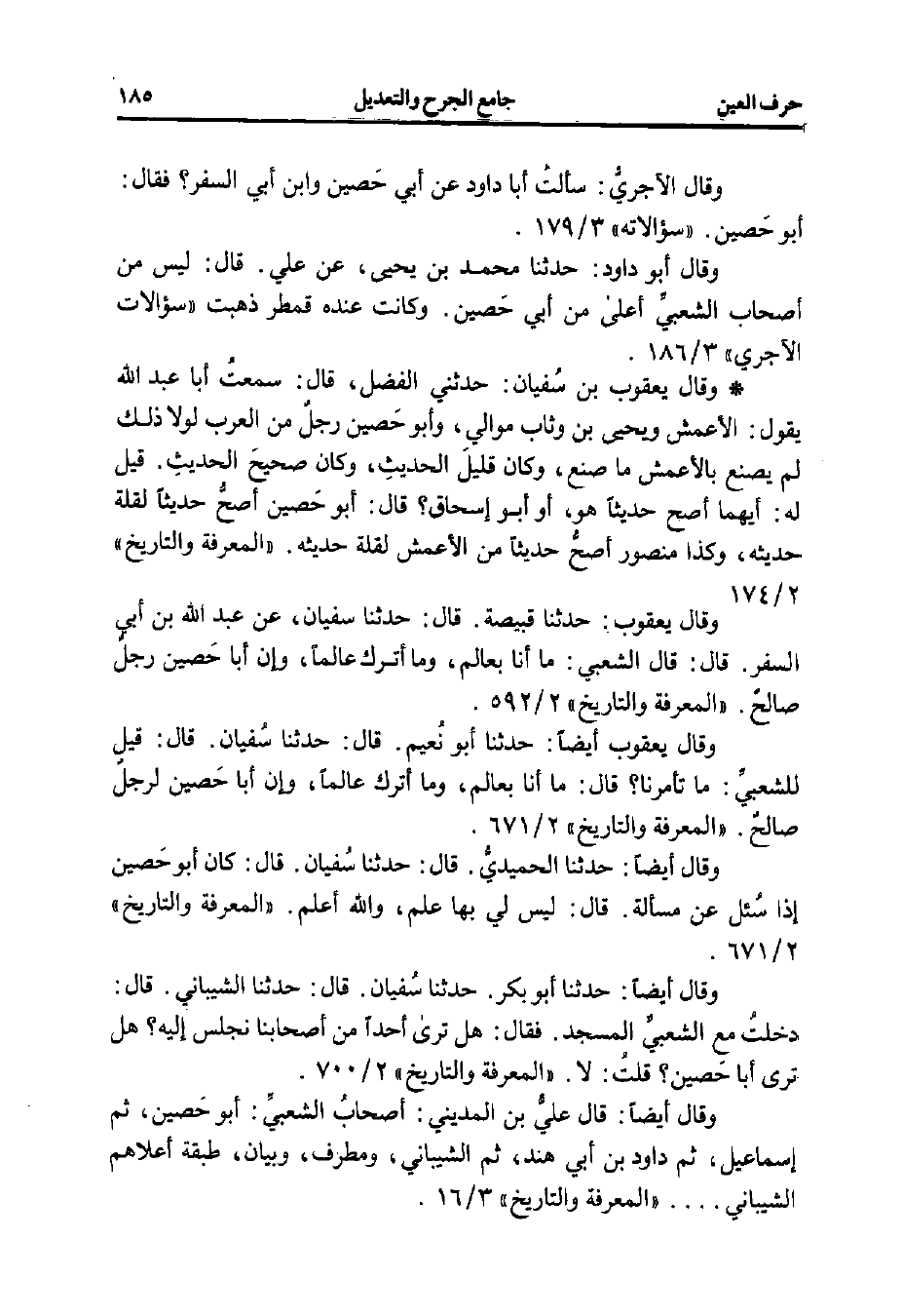وقال يعقوب: حدثنا قبيصة. قال: حدثنا سفيان، عن عبد الله بن أبي السفر. قال: قال الشعبي: ما أنا بعالم، وما أترك عالمًا، وإن أبا حَصين رجلٌ صالحٌ. "المعرفة والتاريخ" 2/ 592.