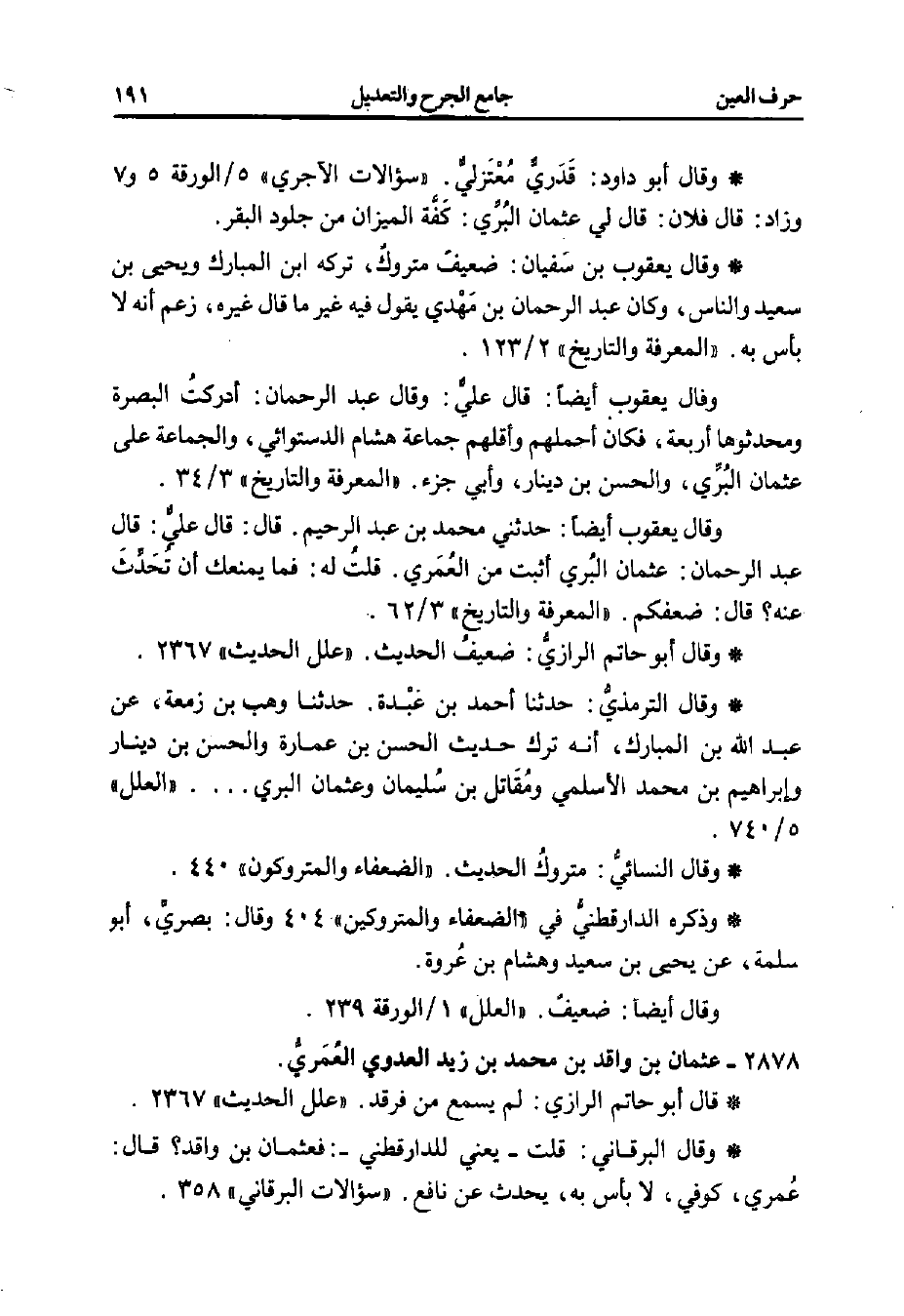 وقال يعقوب أيضًا: حدثني محمد بن عبد الرحيم. قال: قال عليُّ: قال عبد الرحمن: عثمان البُري أثبت من العُمَري. قلتُ له: فما يمنعك أن تحَدِّثَ عنه؟ قال: ضعفكم."المعرفة والتاريخ"3/ 62.