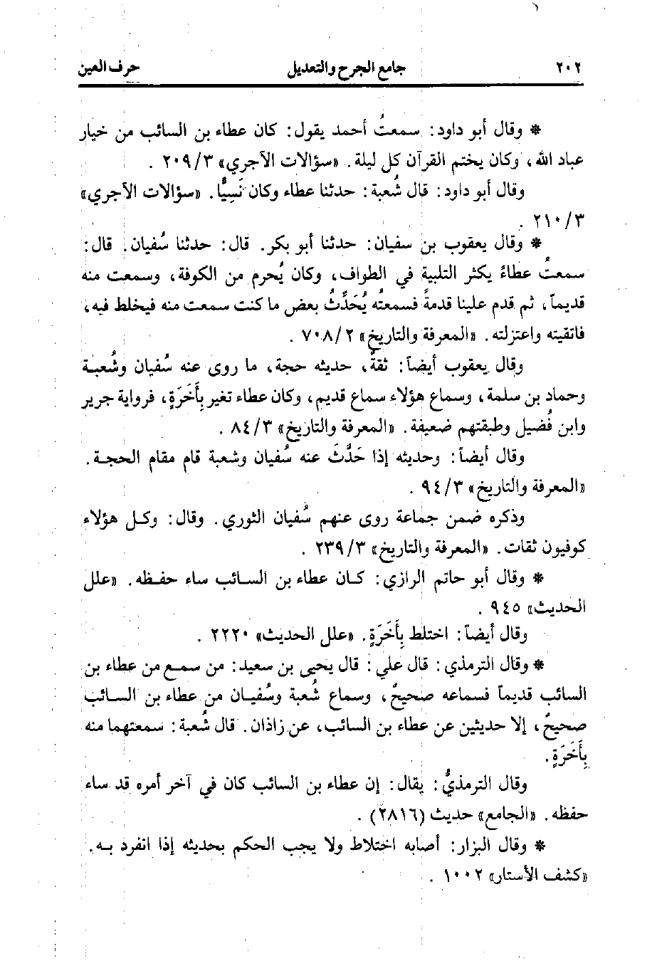 وقال يعقوب أيضًا: ثقةٌ، حديثه حجة، ما روى عنه سُفيان وشُعبة وحماد بن سلمة، وسماع هؤلاء سماع قديم، وكان عطاء تغير بِأَخَرَةٍ، فرواية جرير وابن فُضيل وطبقتهم ضعيفة. "المعرفة والتاريخ" 3/ 84.