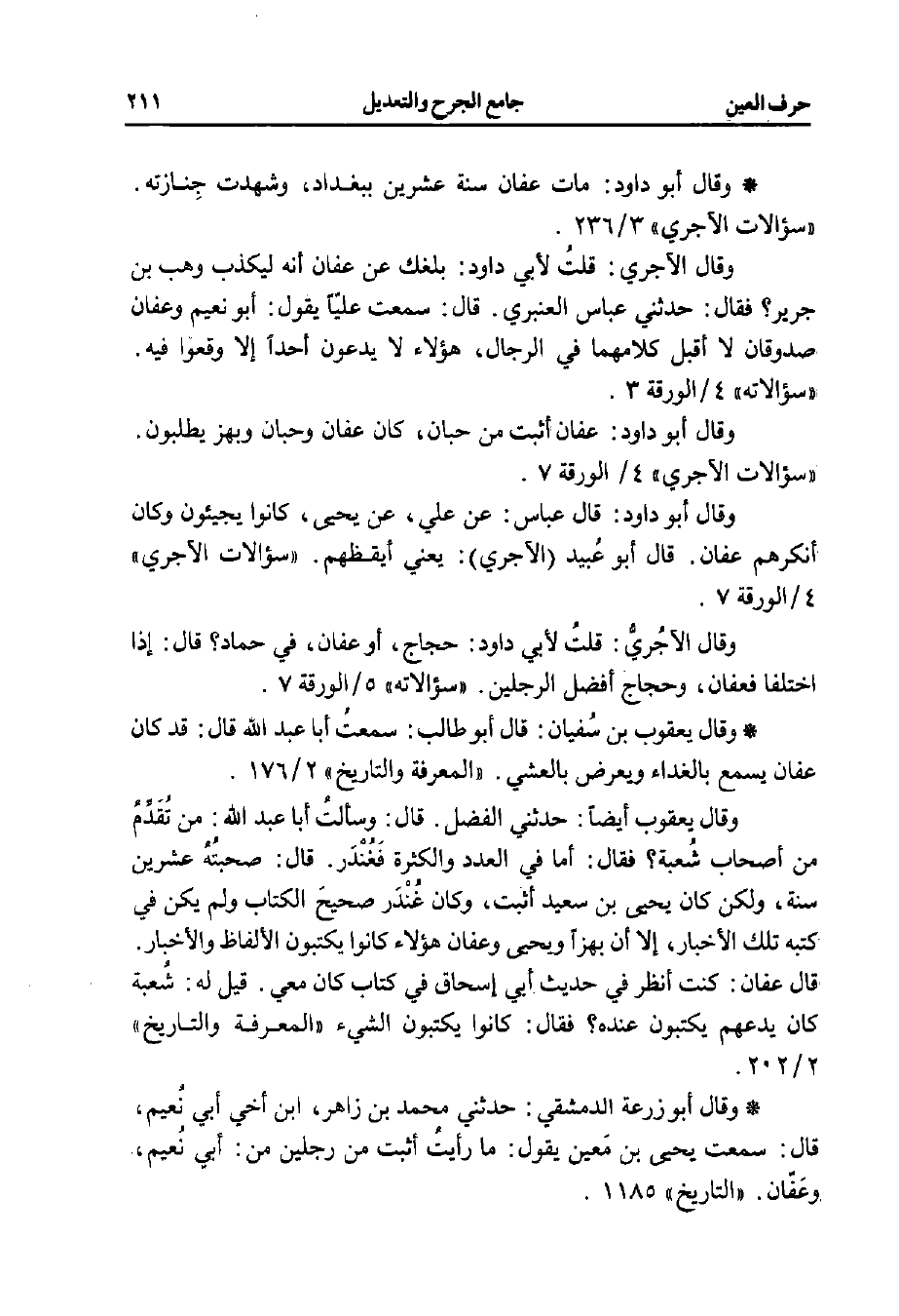 وقال الآجري: قلتُ لأبي داود: بلغك عن عفان أنه ليكذب وهب بن جرير؟ فقال: حدثني عباس العنبري. قال: سمعت عليًّا يقول: أبو نعيم وعفان صدوقان لا أقبل كلامهما في الرجال، هؤلاء لا يدعون أحدًا إلا وقعوا فيه، "سؤالاته" 4/ الورقة 3.