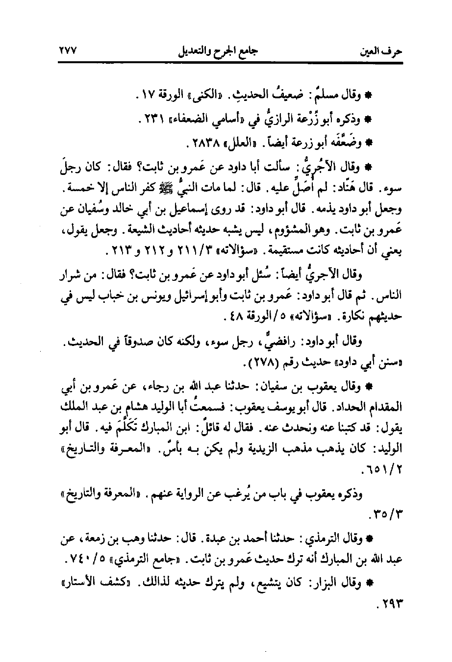 * وقال الآجُري: سألت أبا داود عن عَمرو بن ثابت؟ فقال: كان رجلَ سوء. قال قناد: لم أُصّلِّ عليه. قال: لما مات النبيُّ - صلى الله عليه وسلم - كفر الناس إلا خمسة. وجعل أبو داود يذمه. قال أبو داود: قد روى إسماعيل بن أبي خالد وسُفيان عن عَمرو بن ثابت. وهو المشؤوم، ليس يشبه حديثه أحاديث الشيعة. وجعل يقول، بعني أن أحاديثه كانت مستقيمة "سؤالاته" 3/ 211 و 212 و 213.