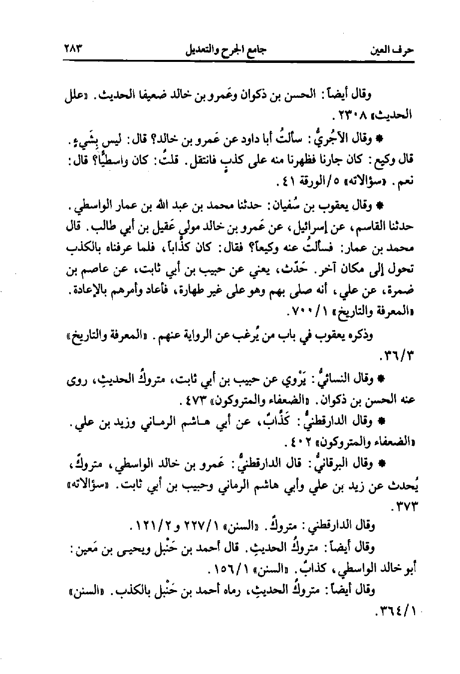 * وقال البرقانيُّ: قال الدارقطنيُّ: عَمرو بن خالد الواسطي، متروكٌ، يُحدث عن زيد بن علي وأبي هاشم الرماني وحبيب بن أبي ثابت. "سؤالاته" 373.