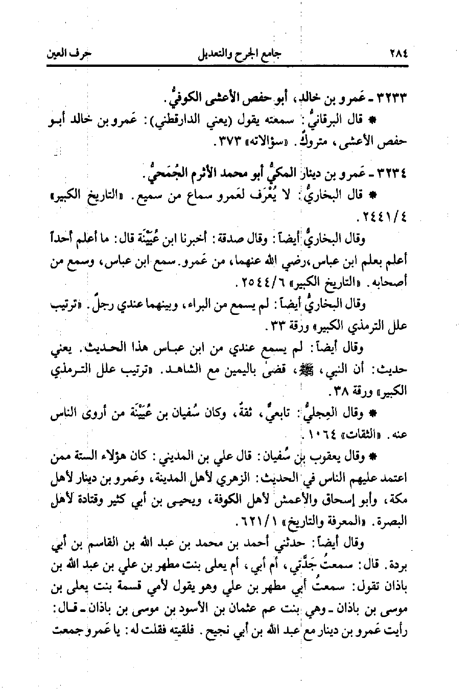 وقال البخاريُّ أيضًا: وقال صدقة: أخبرنا ابن عُيَيْنَة قال: ما أعلم أحدًا أعلم بعلم ابن عباس، رضي اله عنهما، من عَمرو. سمع ابن عباس، وسمع من أصحابه. "التاريخ الكبير" 6/ 2544.