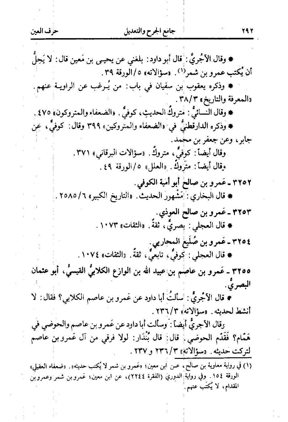 (¬1) في رواية معاوية بن صالح، عن ابن معين؛ "عَمرو بن شمر لا يُكتب حديثه"، "ضعفاء العقيلي" الورقة 154. وفي رواية الدوري (الفقرة 2244)، عن ابن معين؛ عَمرو بن شمر وعمرو بن المقدام، لا يُكْتَب عنهم.
