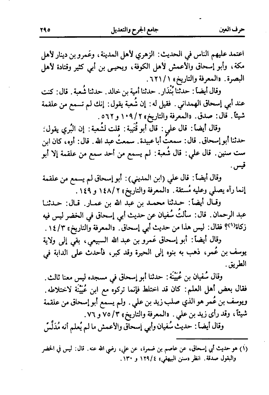 اعتمد عليهم الناس في الحديث: الزهري لأهل المدينة، وعَمرو بن دينار لأهل مكة، وأبو إسحاق والأعمش لأهل الكوفة، ويحيى بن أبي كثير وقتادة لأهل البصرة. "المعرفة والتاريخ" 1/ 621.