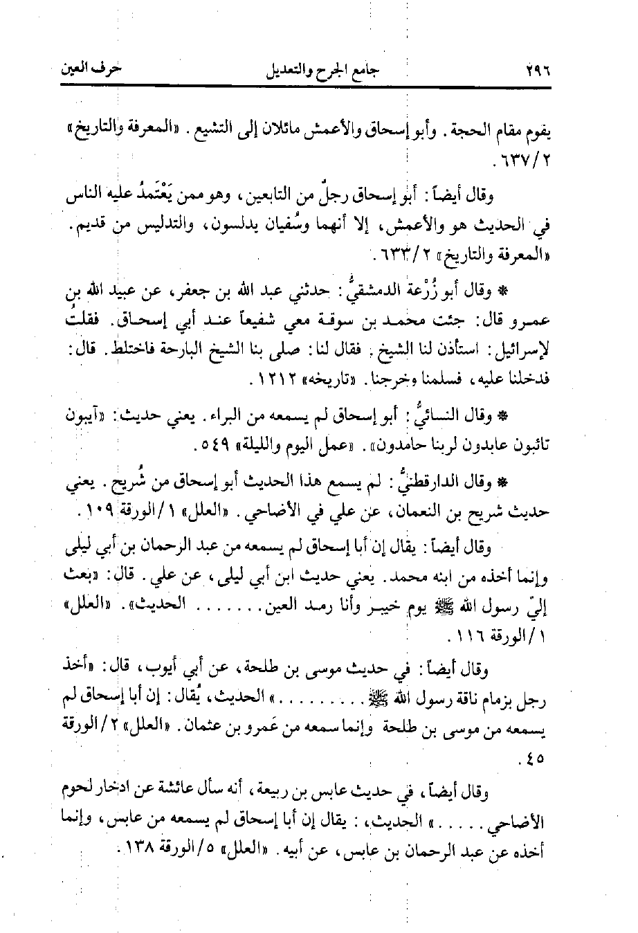 وقال أيضًا: في حديث موسى بن طلحة، عن أبي أيوب، قال: "أخذ رجل بزمام ناقة رسول الله - صلى الله عليه وسلم - ......... "الحديث، يُقال: إن أبا إسحاق لم يسمعه من موسى بن طلحة وإنما سمعه من عَمرو بن عثمان. "العلل" 2/ الورقة 45.