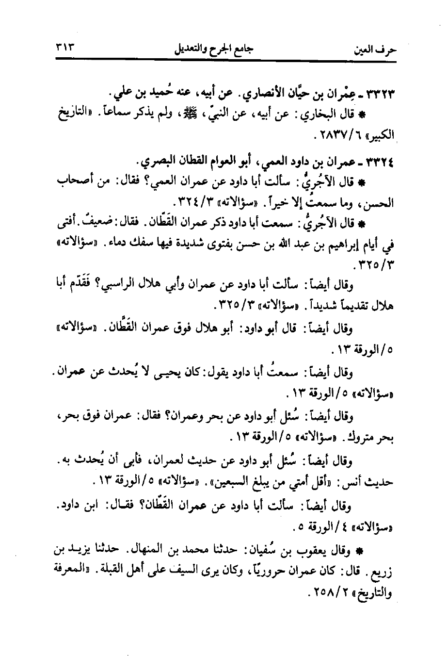 * قال الآجُريُّ: سمعت أبا داود ذكر عمران القَطّان. فقال: ضعيفٌ. أفتى في أيام إبراهيم بن عبد الله بن حسن بفتوى شديدة فيها سفك دماء. "سؤالاته" 3/ 325.