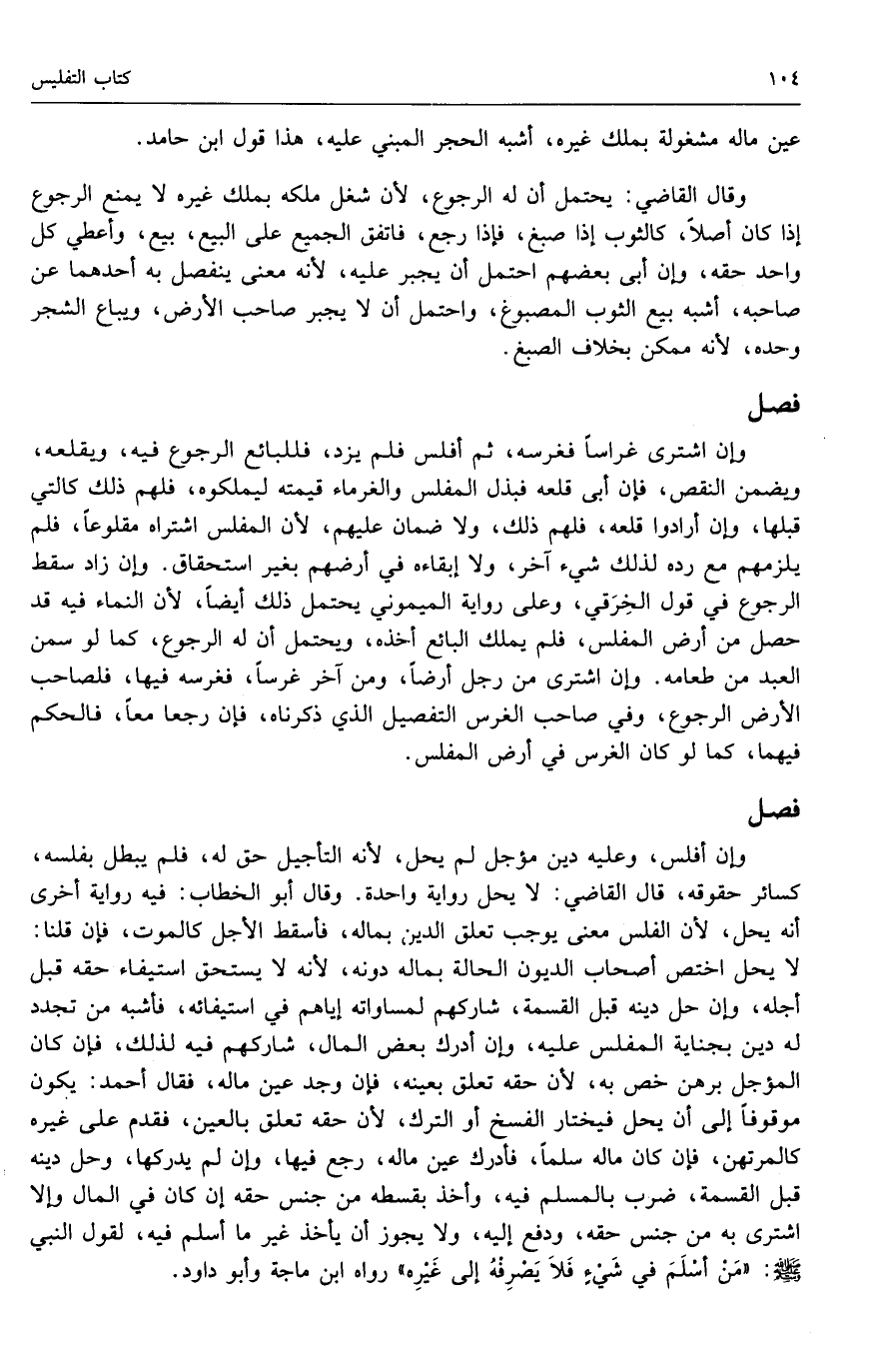وإن أفلس، وعليه دين مؤجل لم يحل؛ لأنه التأجيل حق له، فلم يبطل بفلسه، كسائر حقوقه، قال القاضي: لا يحل رواية واحدة. وقال أبو الخطاب: فيه رواية أخرى أنه يحل؛ لأن الفلس معنى يوجب تعلق الدين بماله، فأسقط الأجل كالموت، فإن قلنا: لا يحل اختص أصحاب الديون الحالة بماله دونه؛ لأنه لا يستحق استيفاء حقه قبل أجله، وإن حل دينه قبل القسمة، شاركهم لمساواته إياهم في استيفائه، فأشبه من تجدد له دين بجناية المفلس عليه، وإن أدرك بعض المال، شاركهم فيه لذلك، فإن كان المؤجل برهن خص به؛ لأن حقه تعلق بعينه، فإن وجد عين ماله، فقال أحمد: يكون موقوفاً إلى أن يحل فيختار الفسخ أو الترك؛ لأن حقه تعلق بالعين، فقدم على غيره كالمرتهن، فإن كان ماله سلماً، فأدرك عين ماله، رجع فيها، وإن لم يدركها، وحل دينه قبل القسمة، ضرب بالمسلم فيه، وأخذ بقسطه من جنس حقه إن كان في المال وإلا اشترى به من جنس حقه، ودفع إليه، ولا يجوز أن يأخذ غير ما أسلم فيه؛ لقول النبي - صَلَّى اللَّهُ عَلَيْهِ وَسَلَّمَ -: «من أسلم في شيء فلا يصرفه إلى غيره» رواه ابن ماجه وأبو داود.