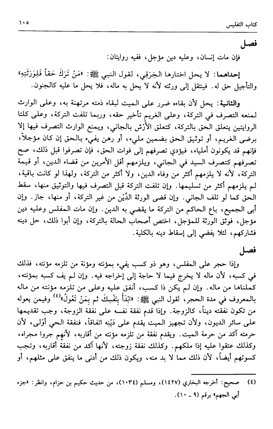 وإذا حجر على المفلس، وهو ذو كسب يفيء بمؤنته ومؤنة من تلزمه مؤنته، فلذلك في كسبه؛ لأن ماله لا يخرج فيما لا حاجة إلى إخراجه فيه. وإن لم يف كسبه بمؤنته، كملناها من ماله. وإن لم يكن ذا كسب، أنفق عليه وعلى من تلزمه مؤنته من ماله بالمعروف في مدة الحجر؛ لقول النبي - صَلَّى اللَّهُ عَلَيْهِ وَسَلَّمَ -: «ابدأ بنفسك ثم بمن تعول» وفيمن يعوله من تكون نفقته ديناً، كالزوجة. وإذا قدم نفقة نفسه على نفقة الزوجة، وجب تقديمها على سائر الديون، ولأن تجهيز الميت يقدم على دينه اتفاقاً، فنفقة الحي أولى؛ لأن حرمته آكد من حرمة الميت. ويقدم نفقة من تلزمه مؤنته من أقاربه؛ لأنهم جروا مجراه، وكذلك عتقوا عليه إذا ملكهم. وكذلك نفقة زوجته؛ لأنها آكد من نفقة أقاربه، وتجب كسوتهم أيضاً؛ لأن ذلك مما لا بد منه، ويكون ذلك من أدنى ما ينفق على مثلهم، أو