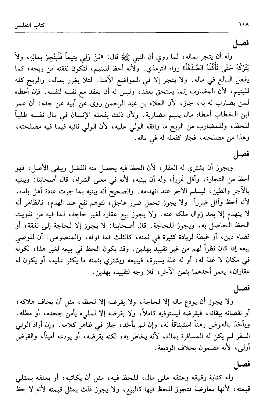 وله أن يتجر بماله؛ لما روي أن النبي - صَلَّى اللَّهُ عَلَيْهِ وَسَلَّمَ - قال: «من ولي يتيماً فليتجر بماله، ولا يتركه حتى تأكله الصدقة» رواه الترمذي. ولأنه أحظ لليتيم؛ لتكون نفقته من ربحه، كما يفعل البالغ في ماله، ولا يتجر إلا في المواضع الآمنة. لئلا يغرر بماله، والربح كله لليتيم؛ لأن المضارب إنما يستحق بعقد، وليس له أن يعقد مع نفسه لنفسه. فإن أعطاه لمن يضارب له به، جاز؛ لأن العلاء بن عبد الرحمن روى عن أبيه عن جده: أن عمر بن الخطاب أعطاه مال يتيم مضاربة. ولأن ذلك يفعله الإنسان في مال نفسه طلباً للحظ، وللمضارب من الربح ما وافقه الولي عليه؛ لأن الولي نائبه فيما فيه مصلحته، وهذا من مصلحته، فجاز كفعله له في ماله.