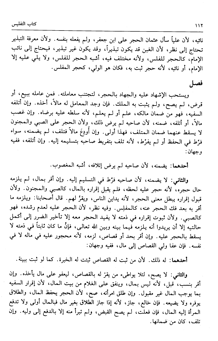 والثاني: لا يضمنه؛ لأن صاحبه فرط في التسليم إليه. وإن أقر بمال، لم يلزمه حال حجره؛ لأنه حجر عليه لحظه، فلم يقبل إقراره بالمال، كالصبي والمجنون. ولأن قبول إقراره يبطل معنى الحجر؛ لأنه يداين الناس، ويقر لهم. قال أصحابنا: ويلزمه ما أقر به بعد فك الحجر عنه، كالمفلس. وفيه نظر؛ لأن الحجر عليه لعدم رشده، فهو كالصبي. ولأن ثبوت إقراره في ذمته لا يفيد الحجر معه إلا تأخير الضرر إلى أكمل حالتيه إلا أن يريدوا أن يلزمه فيما بينه وبين الله تعالى: فإن ما كان ثابتاً في ذمته لا يسقط بالحجر عليه. وإن أقر بحد أو قصاص، لزمه؛ لأنه محجور عليه في ماله لا في نفسه. فإن عفا ولي القصاص إلى ماله، ففيه وجهان: