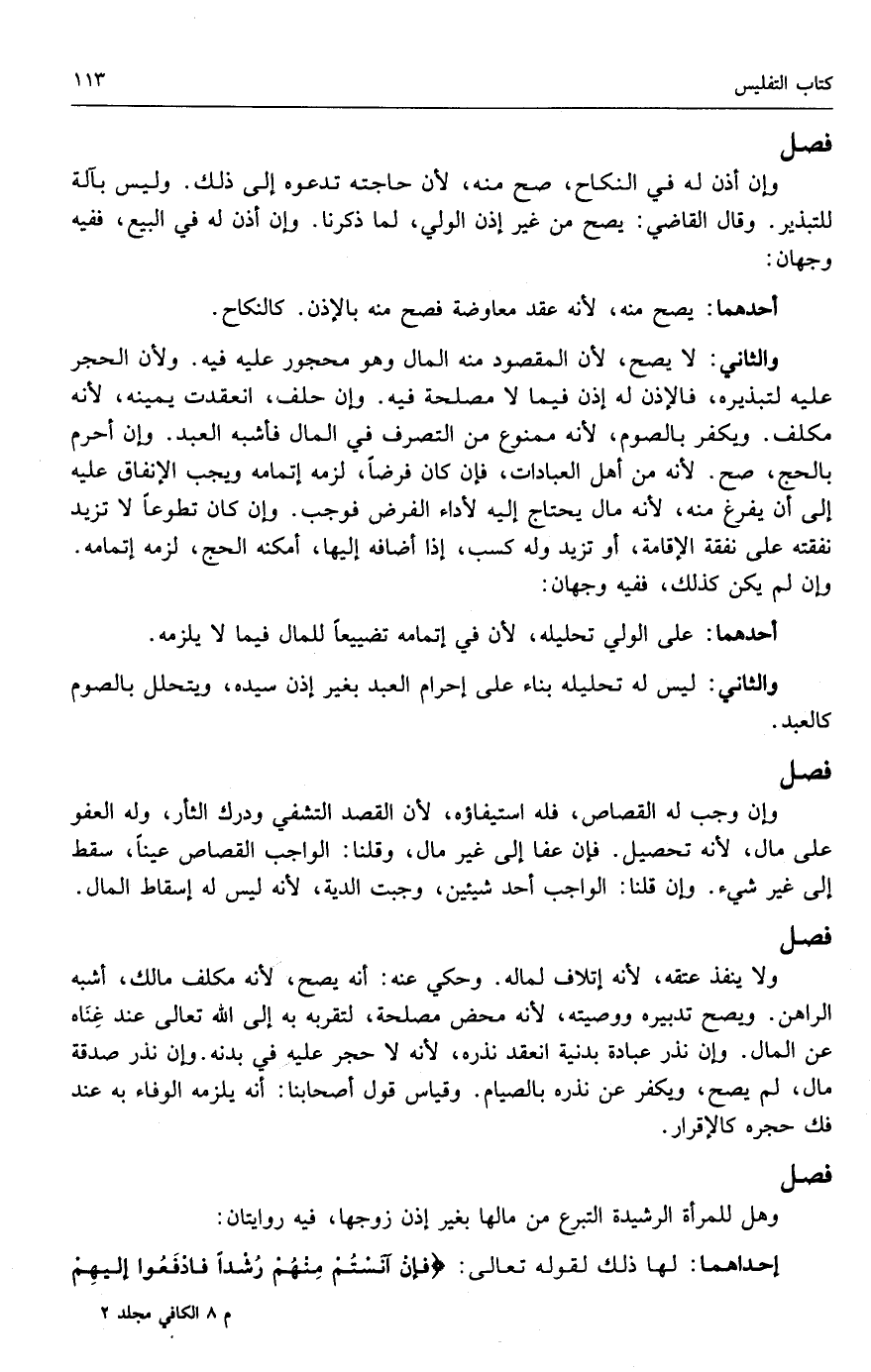 والثاني: لا يصح؛ لأن المقصود منه المال وهو محجور عليه فيه. ولأن الحجر عليه لتبذيره، فالإذن له إذن فيما لا مصلحة فيه. وإن حلف، انعقدت يمينه؛ لأنه مكلف. ويكفر بالصوم؛ لأنه ممنوع من التصرف في المال فأشبه العبد. وإن أحرم بالحج، صح. لأنه من أهل العبادات، فإن كان فرضاً، لزمه إتمامه ويجب الإنفاق عليه إلى أن يفرغ منه؛ لأنه مال يحتاج إليه لأداء الفرض فوجب. وإن كان تطوعاً لا تزيد نفقته على نفقة الإقامة، أو تزيد وله كسب، إذا أضافه إليه، أمكنه الحج، لزمه إتمامه. وإن لم يكن كذلك، ففيه وجهان: