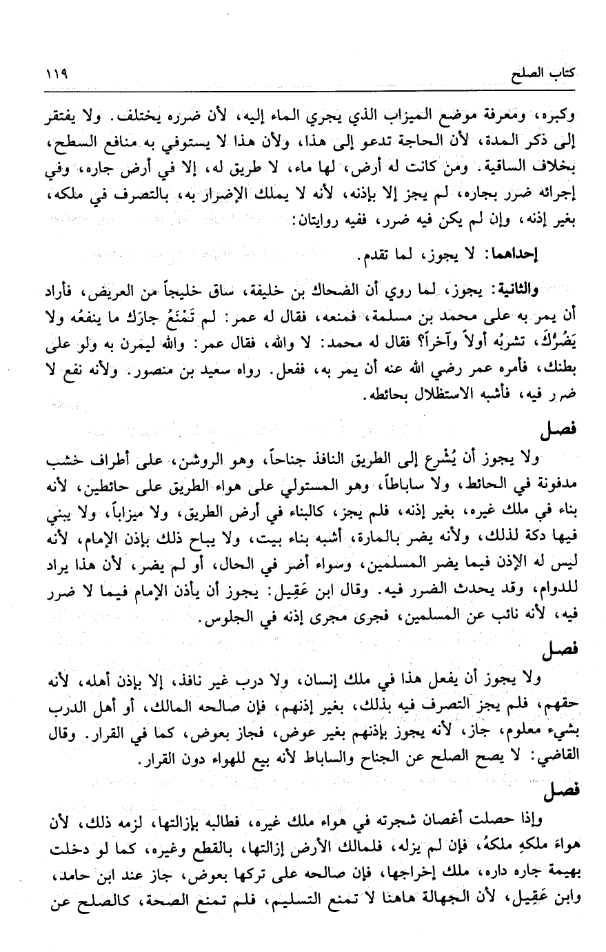 وكبره، ومعرفة موضع الميزاب الذي يجري الماء إليه؛ لأن ضرره يختلف. ولا يفتقر إلى ذكر المدة؛ لأن الحاجة تدعو إلى هذا، ولأن هذا لا يستوفي به منافع السطح، بخلاف الساقية. ومن كانت له أرض، لها ماء، لا طريق له، إلا في أرض جاره، وفي إجرائه ضرر بجاره، لم يجز إلا بإذنه؛ لأنه لا يملك الإضرار به، بالتصرف في ملكه، بغير إذنه، وإن لم يكن فيه ضرر، ففيه روايتان: