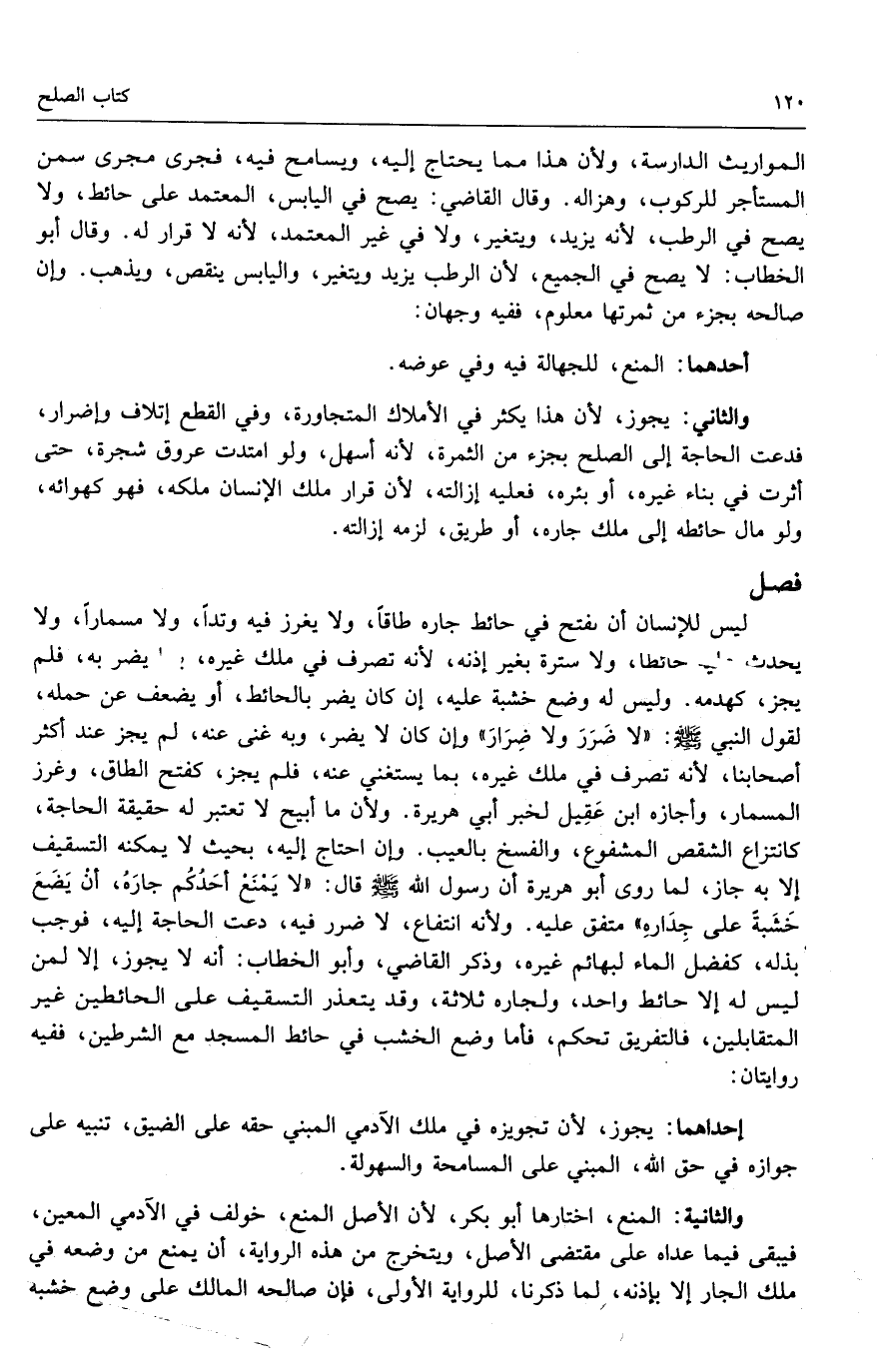 ليس للإنسان أن يفتح في حائط جاره طاقاً، ولا يغرز فيه وتداً، ولا مسماراً، ولا يحدث عليه حائطاً، ولا سترة بغير إذنه؛ لأنه يصرف في ملك غيره، بما يضر به، فلم يجز، كهدمه. وليس له وضع خشبة عليه، إن كان يضر بالحائط، أو يضعف عن حمله؛ لقول النبي - صَلَّى اللَّهُ عَلَيْهِ وَسَلَّمَ -: «لا ضرر ولا ضرار» وإن كان لا يضر، وبه غنى عنه، لم يجز عند أكثر أصحابنا؛ لأنه تصرف في ملك غيره، بما يستغني عنه، فلم يجز، كفتح الطاق، وغرز المسمار، وأجازه ابن عقيل لخبر أبي هريرة. ولأن ما أبيح لا تعتبر له حقيقة الحاجة، كانتزاع الشقص المشفوع، والفسخ بالعيب. وإن احتاج إليه، بحيث لا يمكنه التسقيف إلا به جاز؛ لما روى أبو هريرة أن رسول الله - صَلَّى اللَّهُ عَلَيْهِ وَسَلَّمَ - قال: «لا يمنع أحدكم جاره، أن يضع خشبة على جداره» متفق عليه. ولأنه انتفاع، لا ضرر فيه، دعت الحاجة إليه، فوجب بذله، كفضل الماء لبهائم غيره، وذكر القاضي، وأبو الخطاب: أنه لا يجوز، إلا لمن ليس له إلا حائط واحد، ولجاره ثلاثة، وقد يتعذر التسقيف على الحائطين غير المتقابلين، فالتفريق تحكم، فأما وضع الخشب في حائط المسجد مع الشرطين، ففيه روايتان: