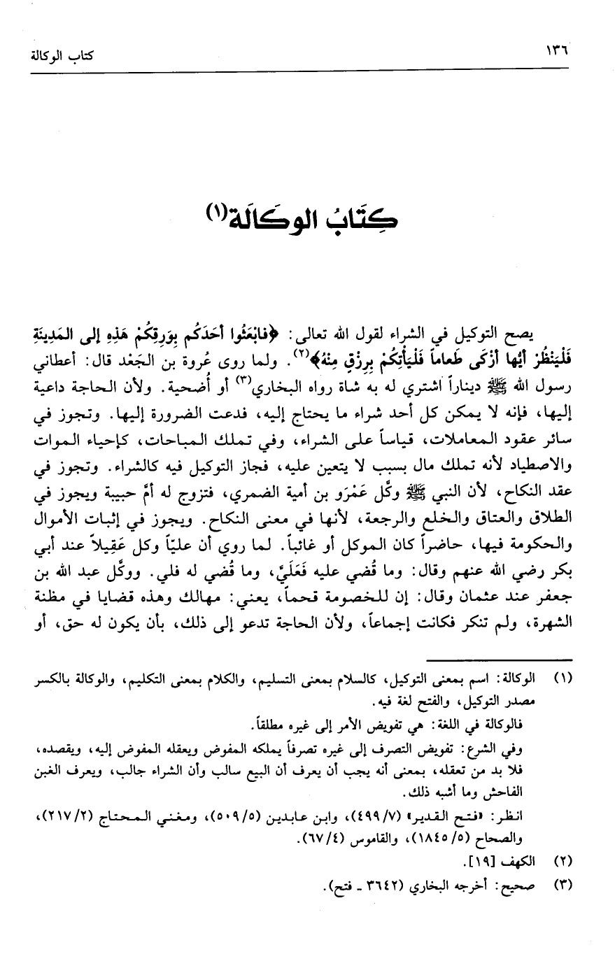 يصح التوكيل في الشراء؛ لقول الله تعالى: {فَابْعَثُوا أَحَدَكُمْ بِوَرِقِكُمْ هَذِهِ إِلَى الْمَدِينَةِ فَلْيَنْظُرْ أَيُّهَا أَزْكَى طَعَامًا فَلْيَأْتِكُمْ بِرِزْقٍ مِنْهُ} [الكهف: 19] ولما روى عروة بن الجعد قال: «أعطاني رسول الله - صَلَّى اللَّهُ عَلَيْهِ وَسَلَّمَ - ديناراً أشتري له به شاة» رواه البخاري أو أضحية، ولأن الحاجة داعية إليها، فإنه لا يمكن كل أحد شراء ما يحتاج إليه، فدعت الضرورة إليها، وتجوز في سائر عقود المعاملات، قياساً على الشراء، وفي تملك المباحات، كإحياء الموات والاصطياد؛ لأنه تملك مال بسبب لا يتعين عليه، فجاز التوكيل فيه كالشراء، وتجوز في عقد النكاح؛ «لأن النبي - صَلَّى اللَّهُ عَلَيْهِ وَسَلَّمَ - وكل عمر بن أمية الضمري، فتزوج له أم حبيبة،» وتجوز في الطلاق والعتاق والخلع والرجعة؛ لأنها في معنى النكاح، ويجوز في إثبات الأموال والحكومة فيها، حاضراً كان الموكل أو غائباً؛ لما روي أن علياً وكل عقيلاً عند أبي بكر - رَضِيَ اللَّهُ عَنْهُمْ - وقال: وما قضي عليه فعلي، وما قضي له فلي، ووكل عبد الله بن جعفر عند عثمان وقال: إن للخصومة قحماً، يعني: مهالك وهذه قضايا في مظنة الشهرة، ولم تنكر فكانت إجماعاً، ولأن الحاجة تدعو إلى ذلك، بأن يكون له حق، أو