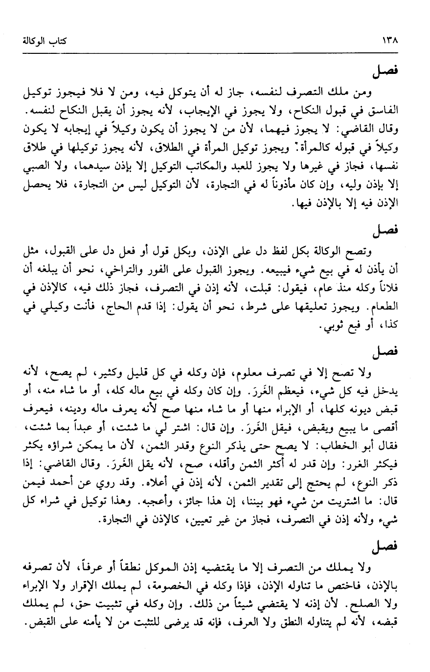 ولا تصح إلا في تصرف معلوم، فإن وكله في كل قليل وكثير، لم يصح؛ لأنه يدخل فيه كل شيء، فيعظم الغرر، وإن كان وكله في بيع ماله كله، أو ما شاء منه، أو قبض ديونه كلها، أو الإبراء منها أو ما شاء منها صح؛ لأنه يعرف ماله ودينه، فيعرف أقصى ما يبيع ويقبض، فيقل الغرر، وإن قال: اشتر لي ما شئت، أو عبداً بما شئت، فقال أبو الخطاب: لا يصح حتى يذكر النوع وقدر الثمن؛ لأن ما يمكن شراؤه يكثر فيكثر الغرر: وإن قدر له أكثر الثمن وأقله، صح؛ لأنه يقل الغرر، وقال القاضي: إذا ذكر النوع، لم يحتج إلى تقدير الثمن؛ لأنه إذن في أعلاه، وقد روي عن أحمد فيمن قال: ما اشتريت من شيء فهو بيننا، إن هذا جائز، وأعجبه، وهذا توكيل في شراء كل شيء، ولأنه إذن في التصرف، فجاز من غير تعيين، كالإذن في التجارة.