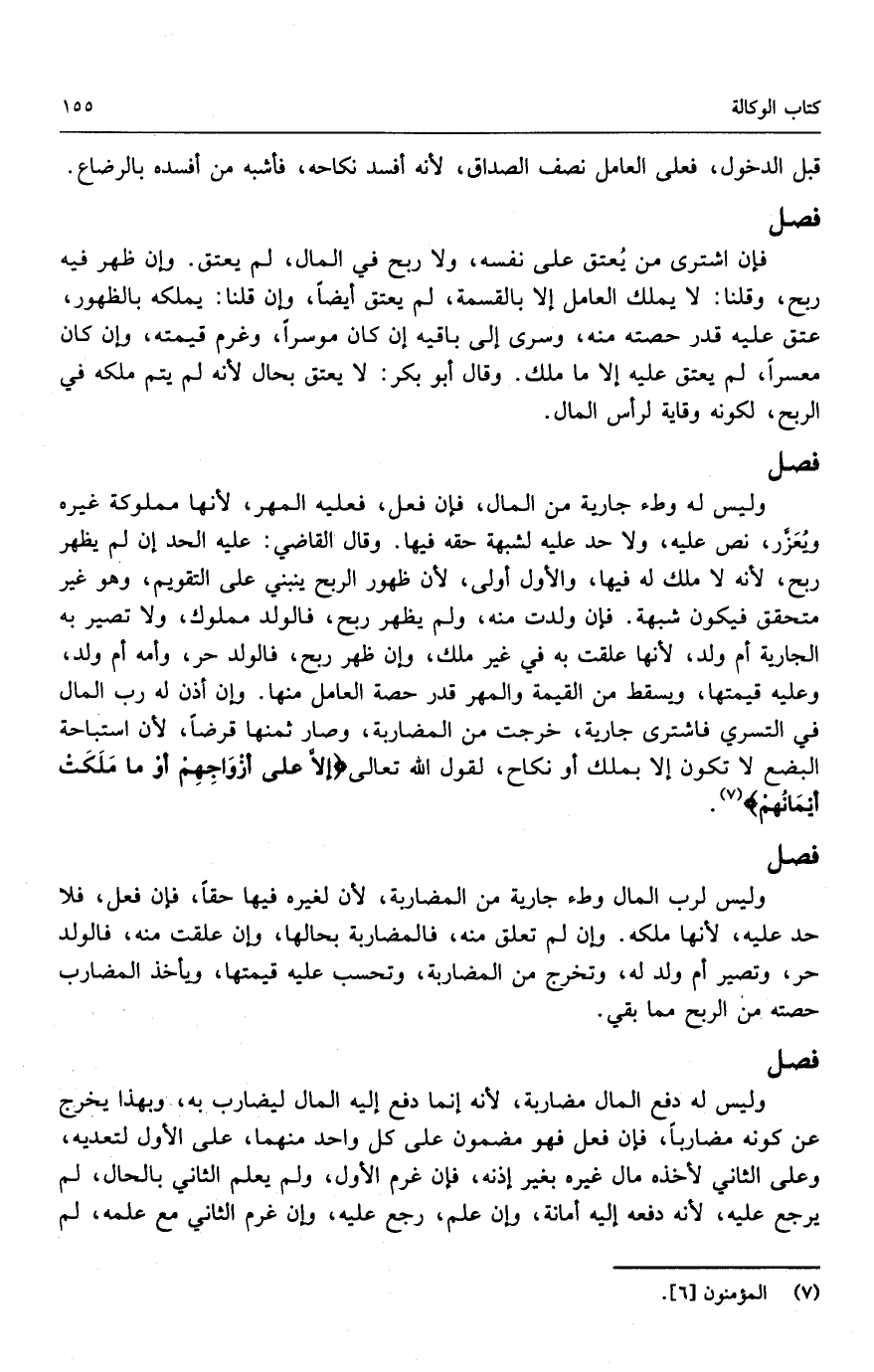 فإن ولدت منه، ولم يظهر ربح، فالولد مملوك، ولا تصير به الجارية أم ولد؛ لأنها علقت به في غير ملك، وإن ظهر ربح، فالولد حر، وأمه أم ولد، وعليه قيمتها، ويسقط من القيمة والمهر قدر حصة العامل منها، وإن أذن له رب المال في التسري فاشترى جارية، خرجت من المضاربة، وصار ثمنها قرضاً؛ لأن استباحة البضع لا تكون إلا بملك أو نكاح؛ لقول الله تعالى: {إِلا عَلَى أَزْوَاجِهِمْ أوْ مَا مَلَكَتْ أَيْمَانُهُمْ} [المؤمنون: 6] .